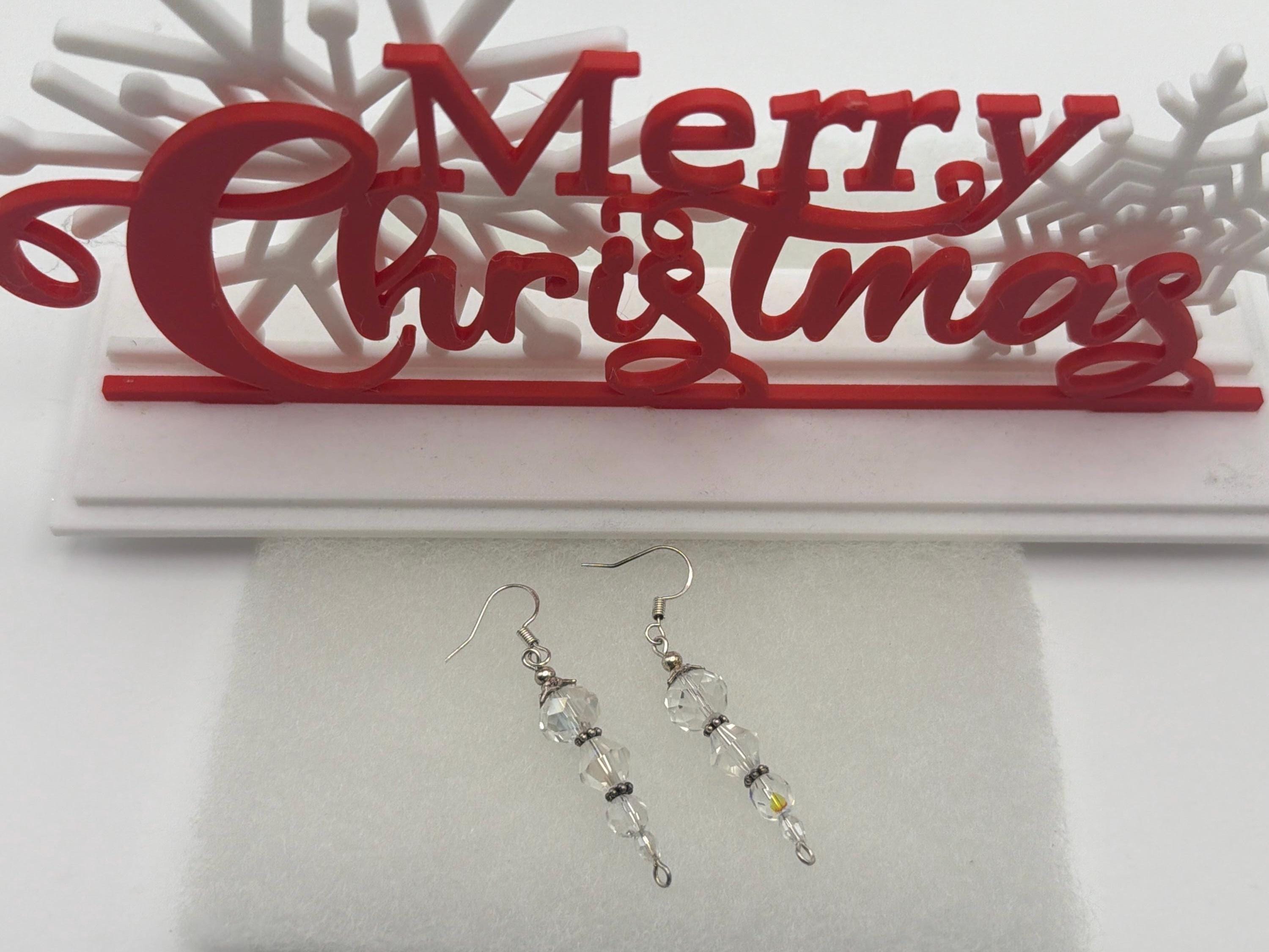 These earrings are made with a silver filigree bead, clear faceted bead, white Pearl bead, clear teardrop bead and daisy spacers.