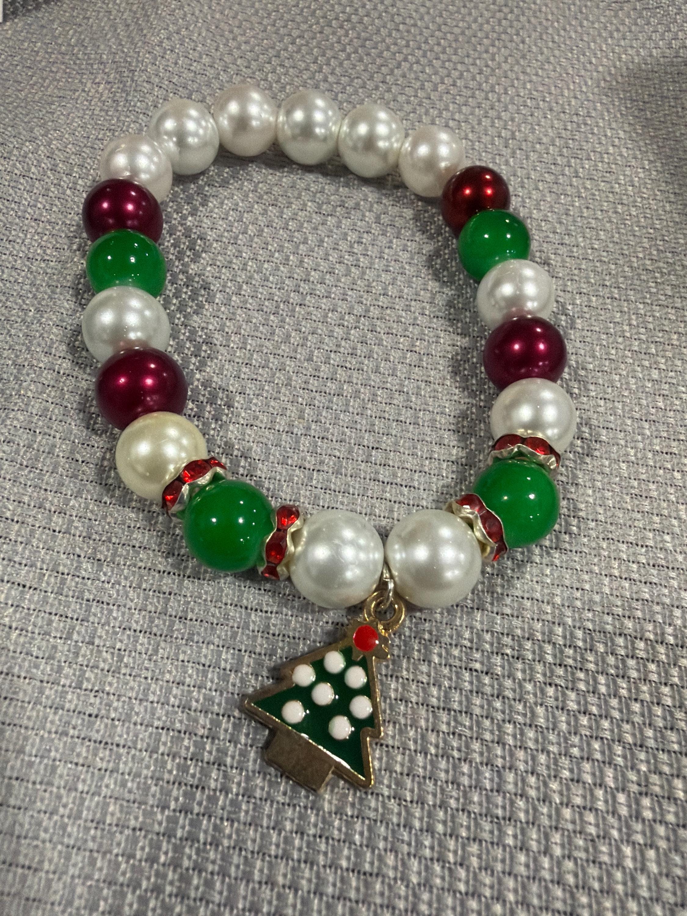 This bracelet is made with white, red and green glass beads and has an enamel Christmas tree charm.