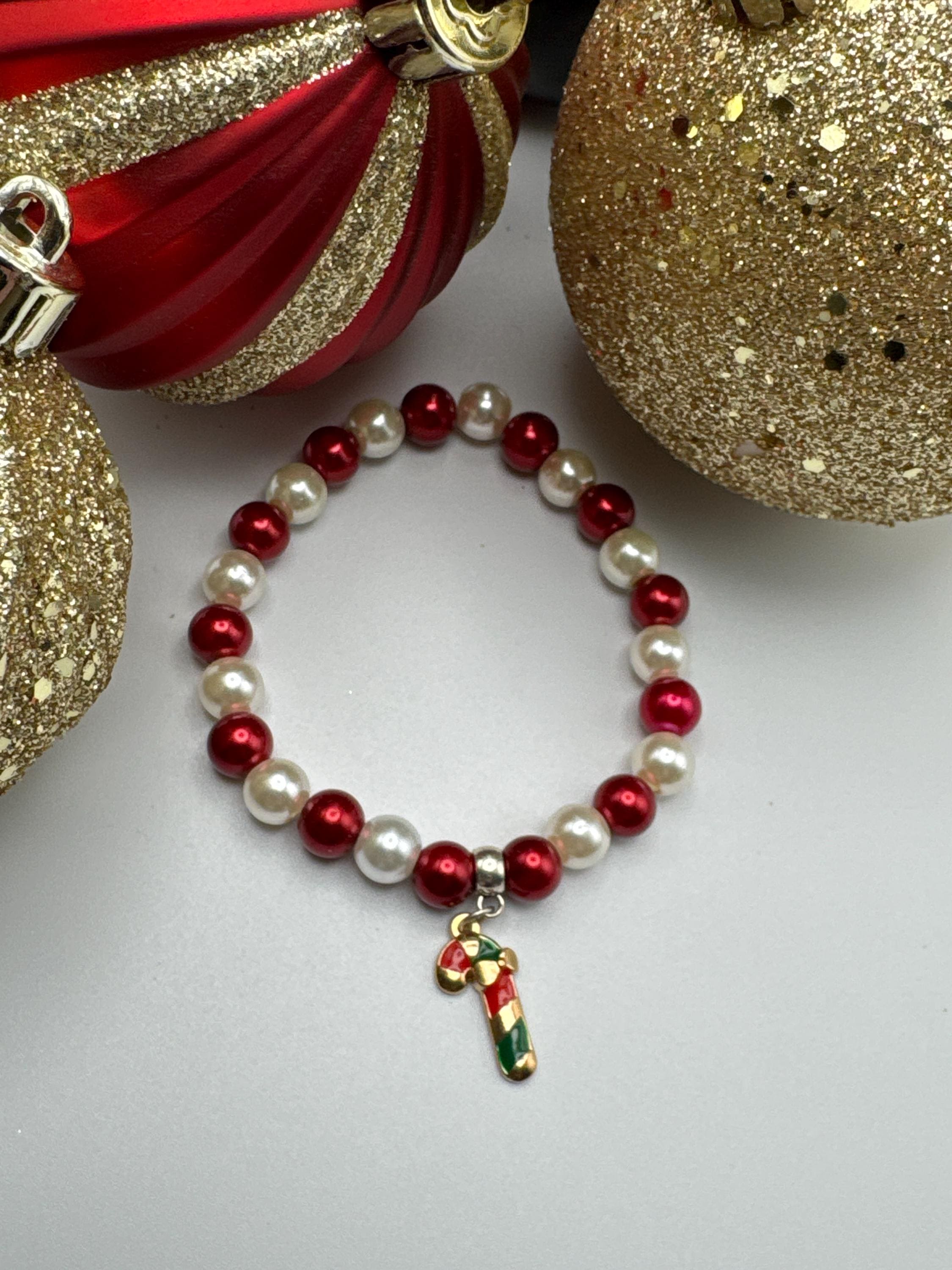 This bracelet is made with red & ivory Pearl beads and has a candy cane charm.