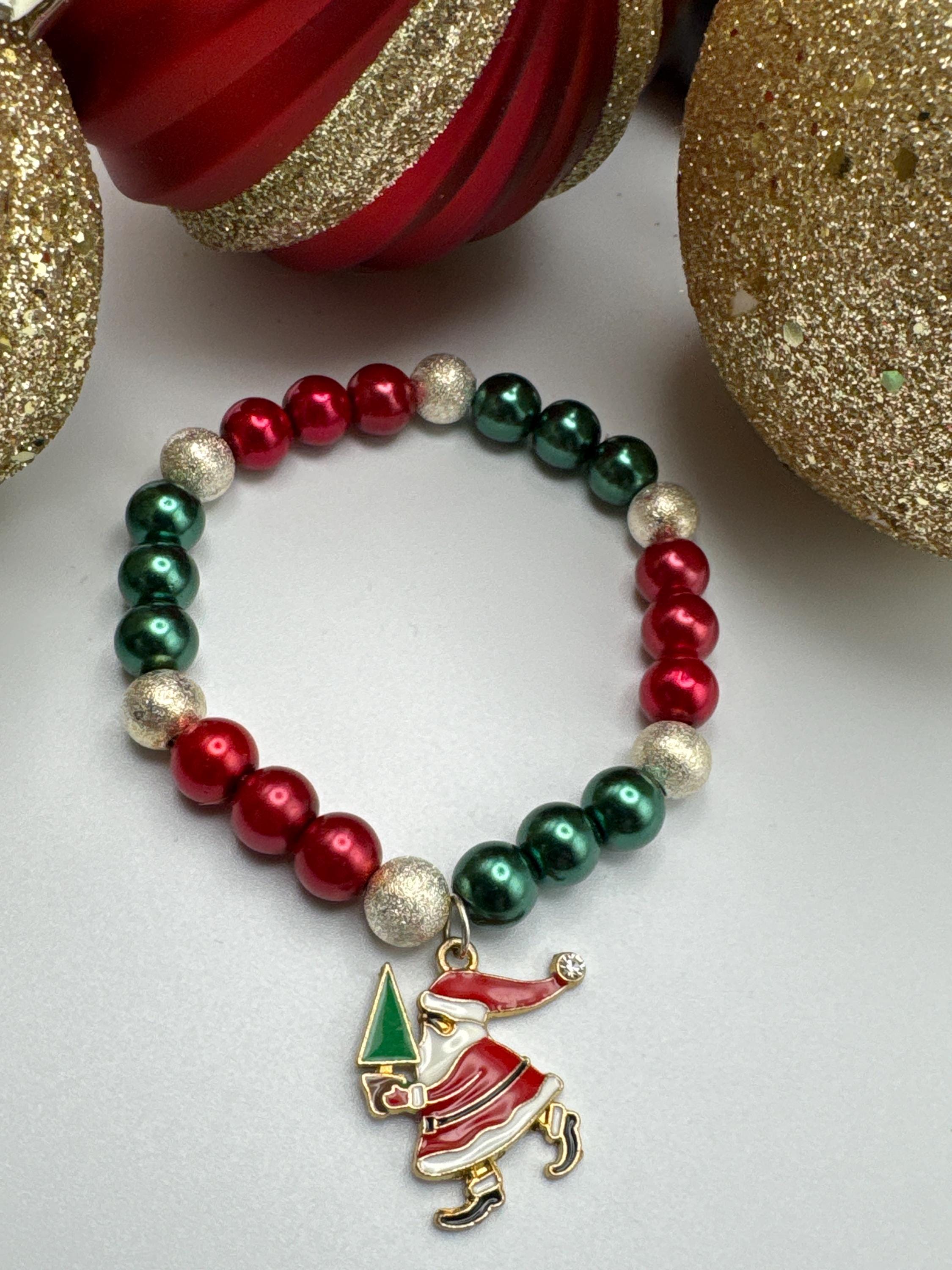 This bracelet is made with green and red pearl beads and silver beads and has a Santa enamel charm.