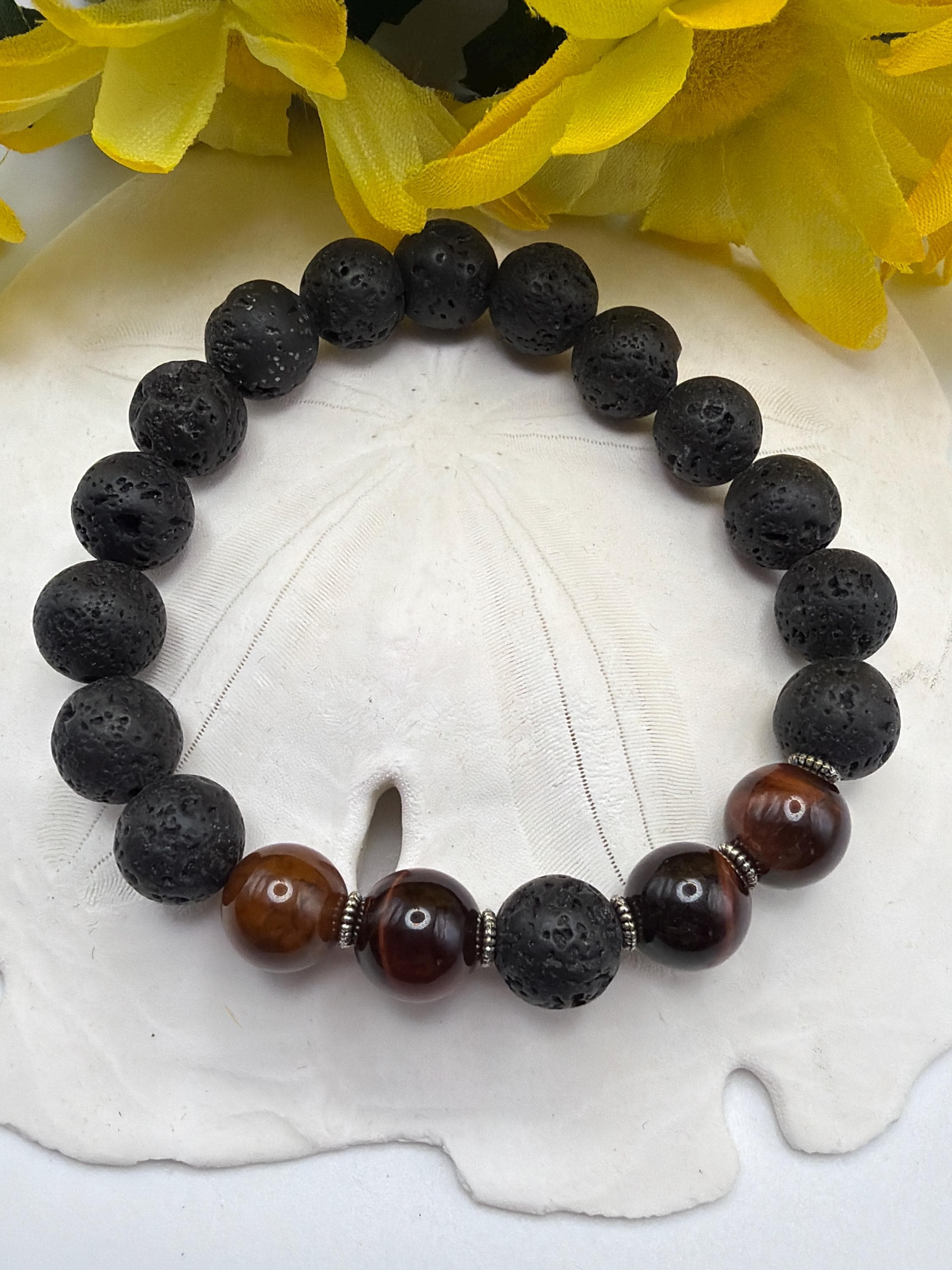This bracelet is made with all 10mm natural tiger eye beads, silver spacers and black lava stone beads