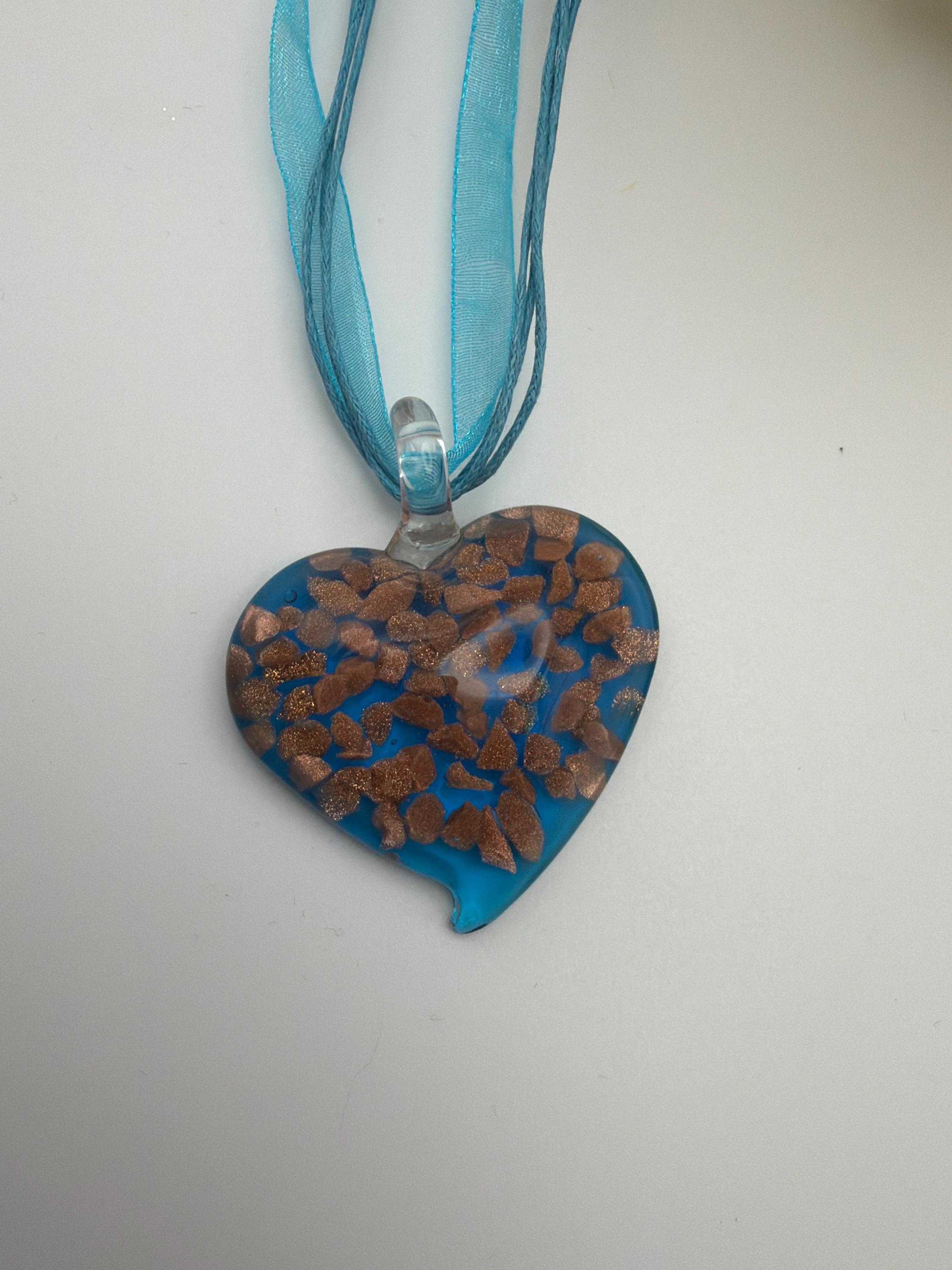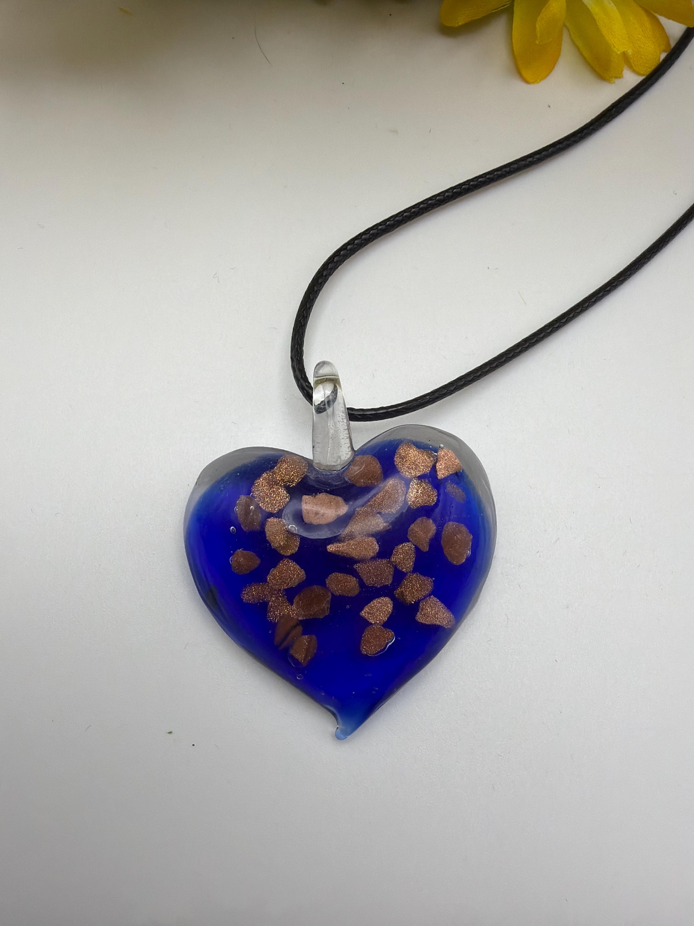 This necklace is made with a glass Lampwork heart pendant that is blue for the main Color with gold flecks.