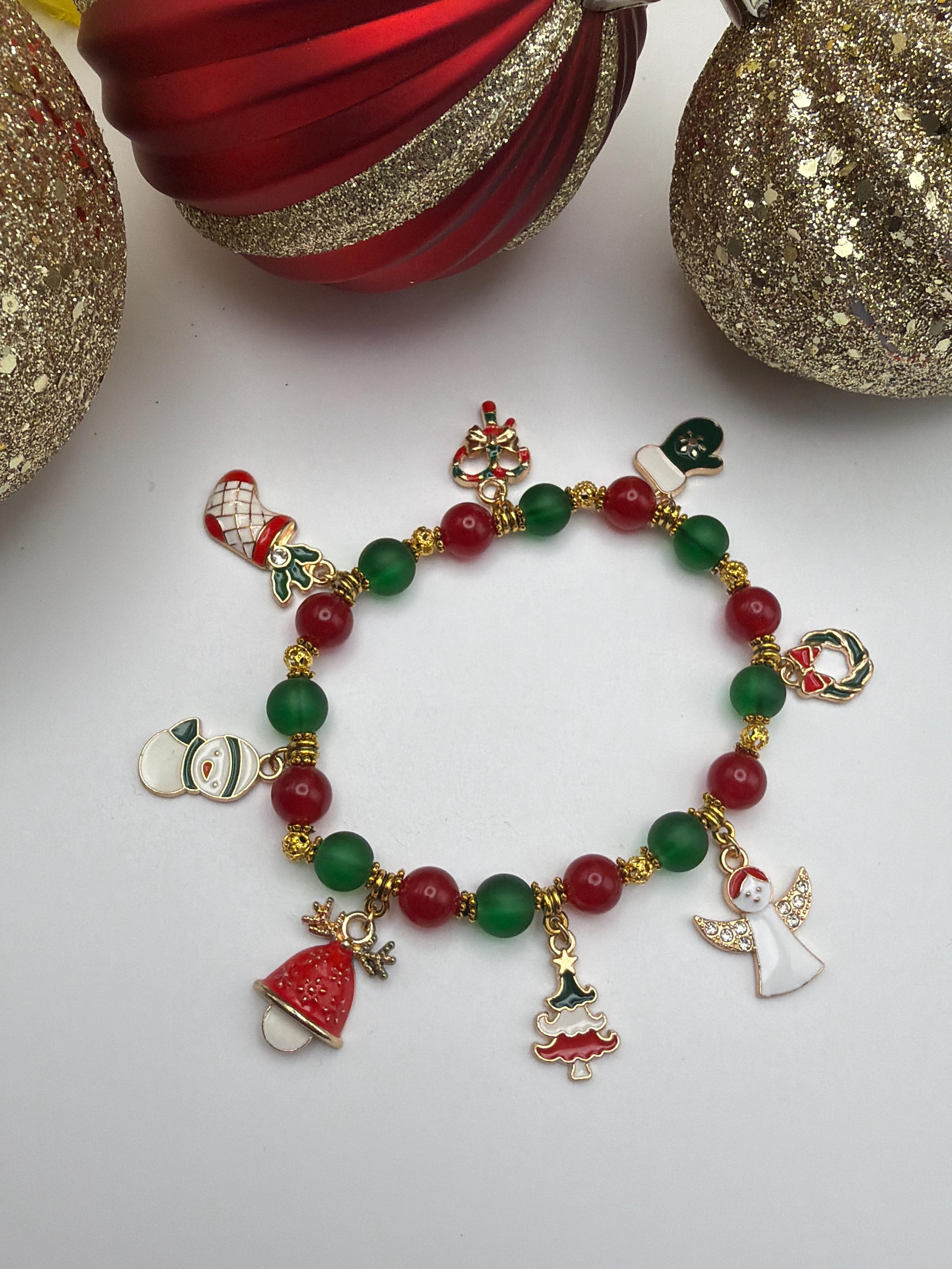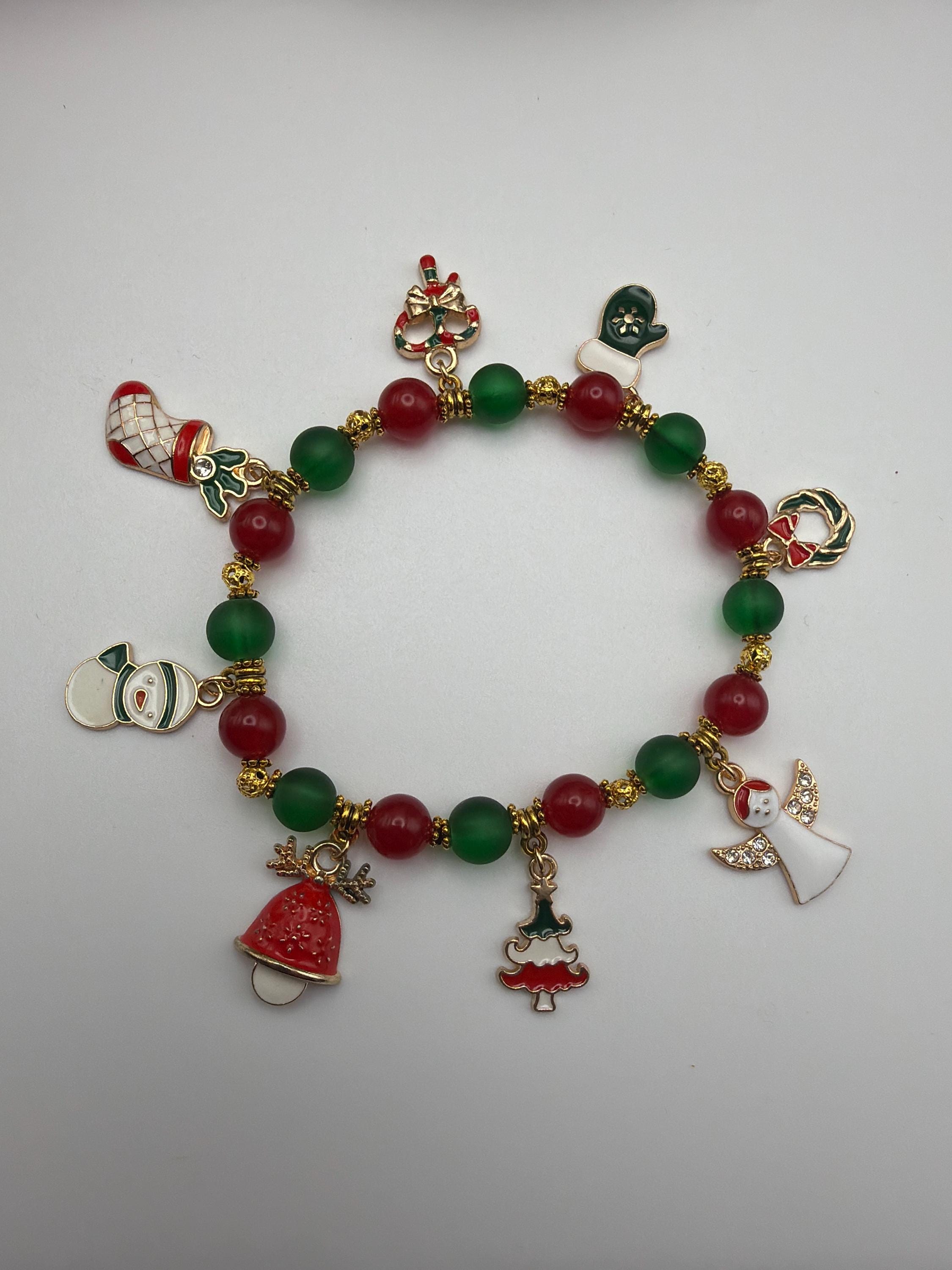 This bracelet is made with enamel Christmas charms, gold filigree beads, gold daisy spacers, green and red glass beads.