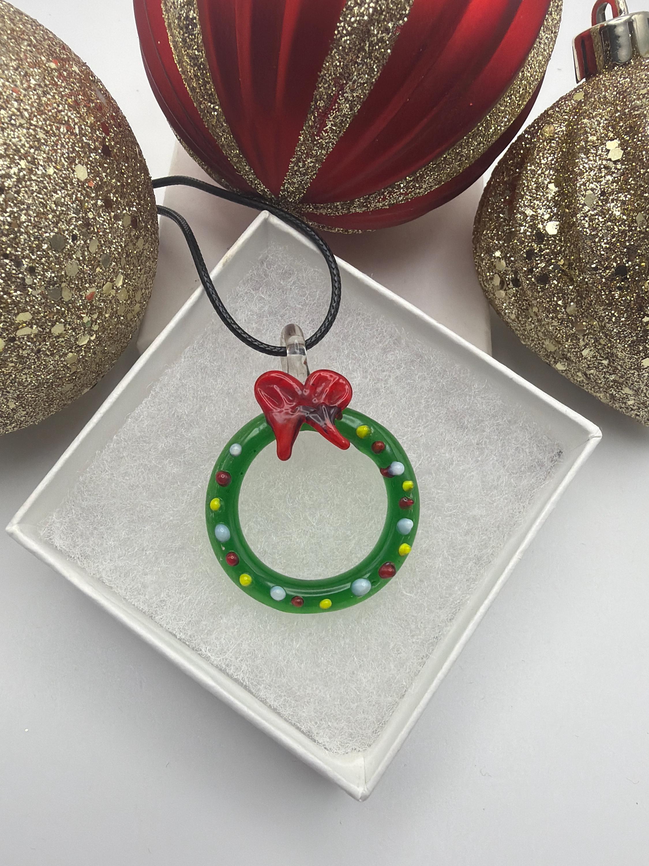 This necklace is made with a hand blown Murano inspired glass Christmas wreath