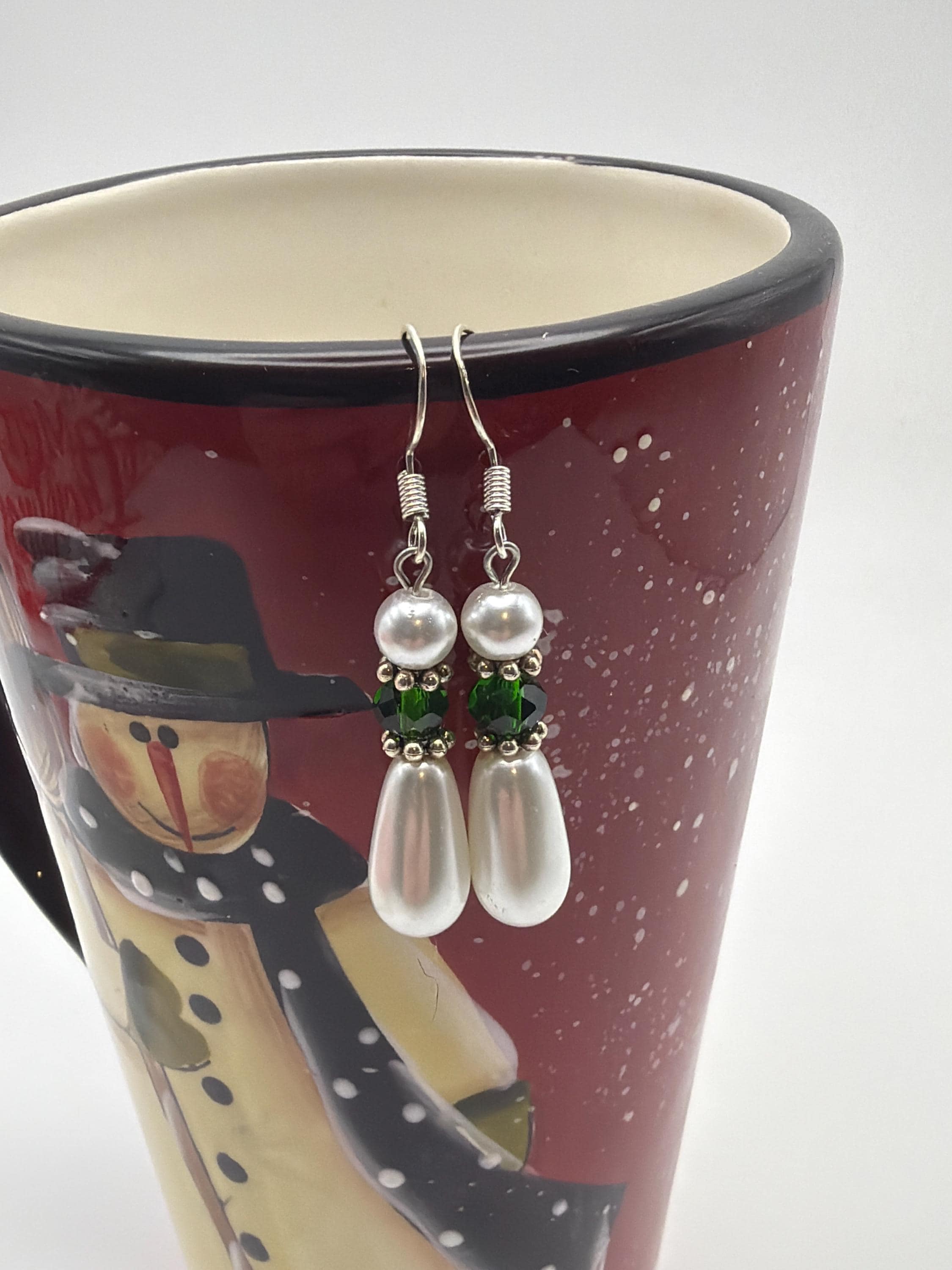 These earrings are made with a white pearl teardrop bead, white pearl bead, daisy spacers and a green faceted bead.