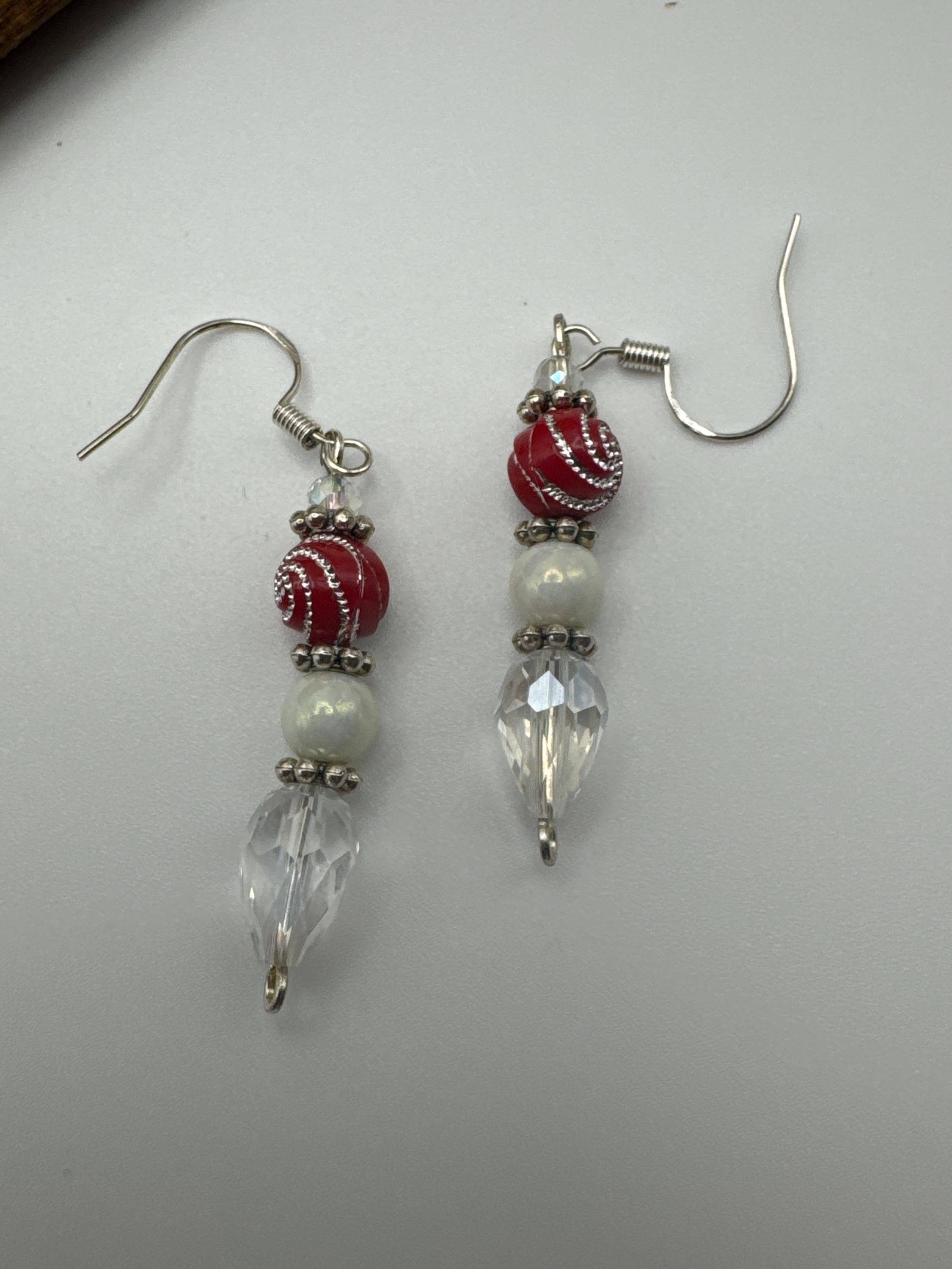 These earrings are made with a red swirl bead, clear faceted teardrop bead, clear faceted bead, white glass bead and daisy spacers.