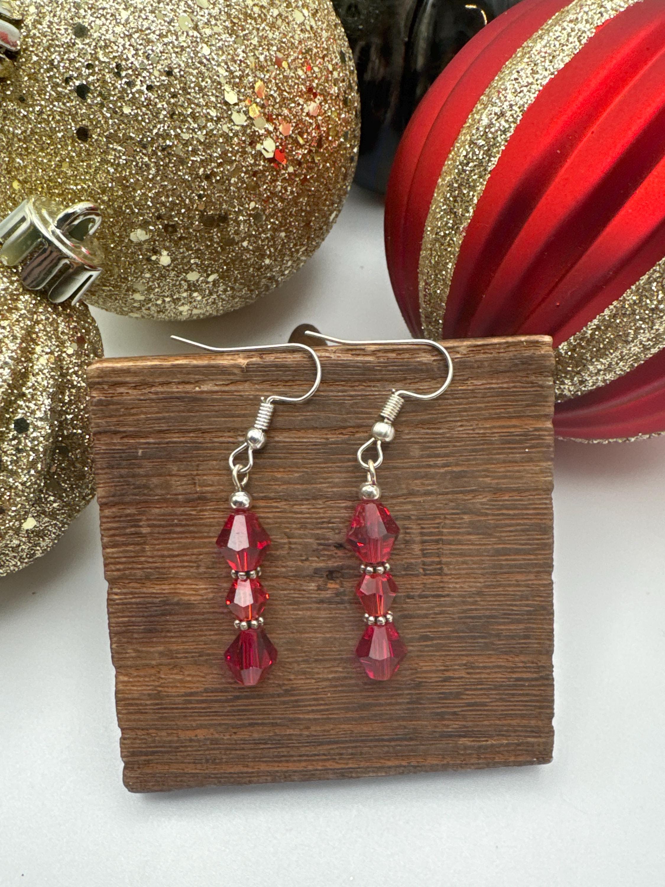 These earrings are made with red faceted bicone beads, daisy spacers and a silver bead