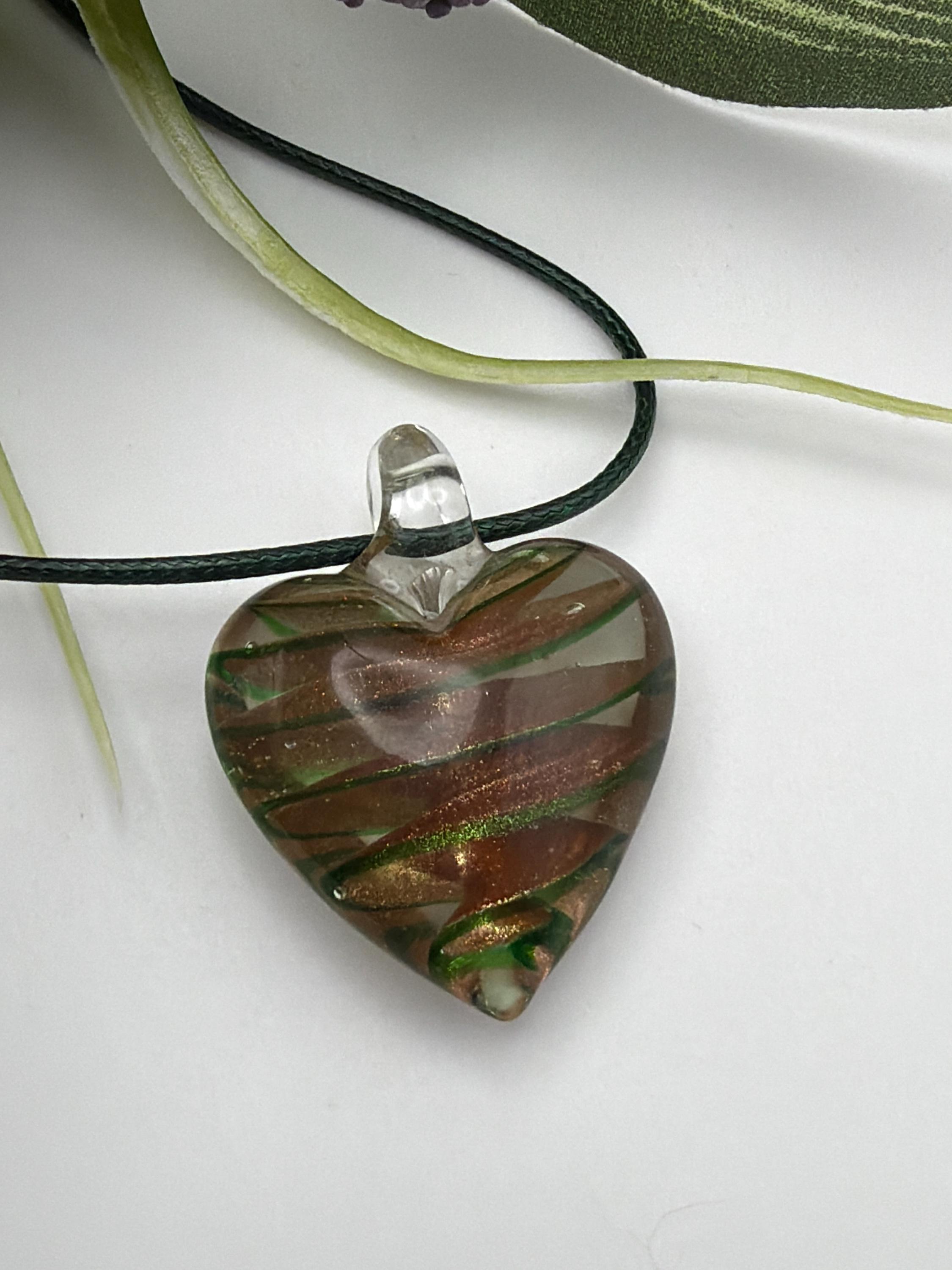This necklace is made with a glass swirl heart Lampwork pendant with green and gold Colors.