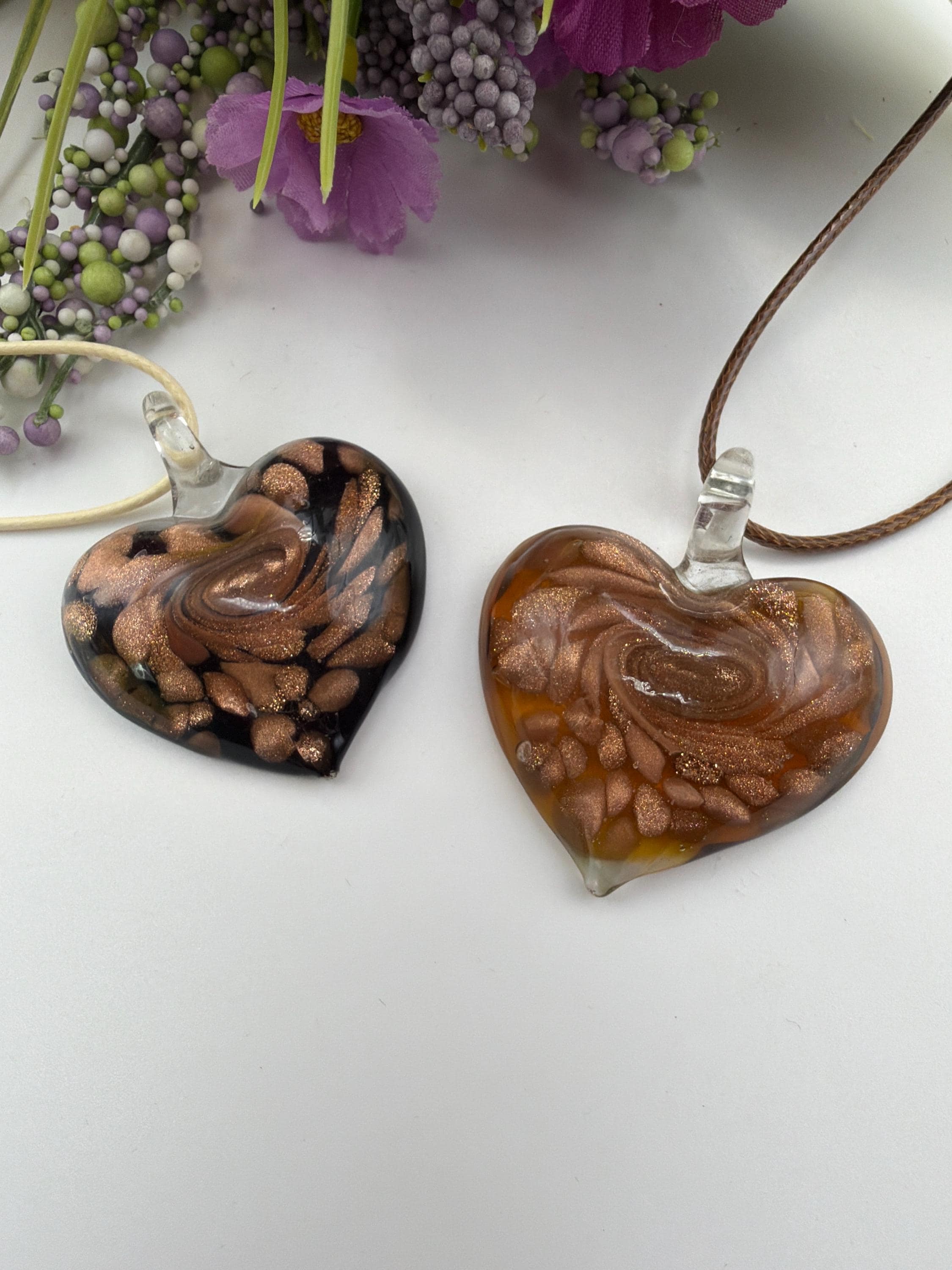 🩴This necklaces is made with a lampwork glass heart pendant and will add flair to any outfit. They each have a different background color with gold accent design.