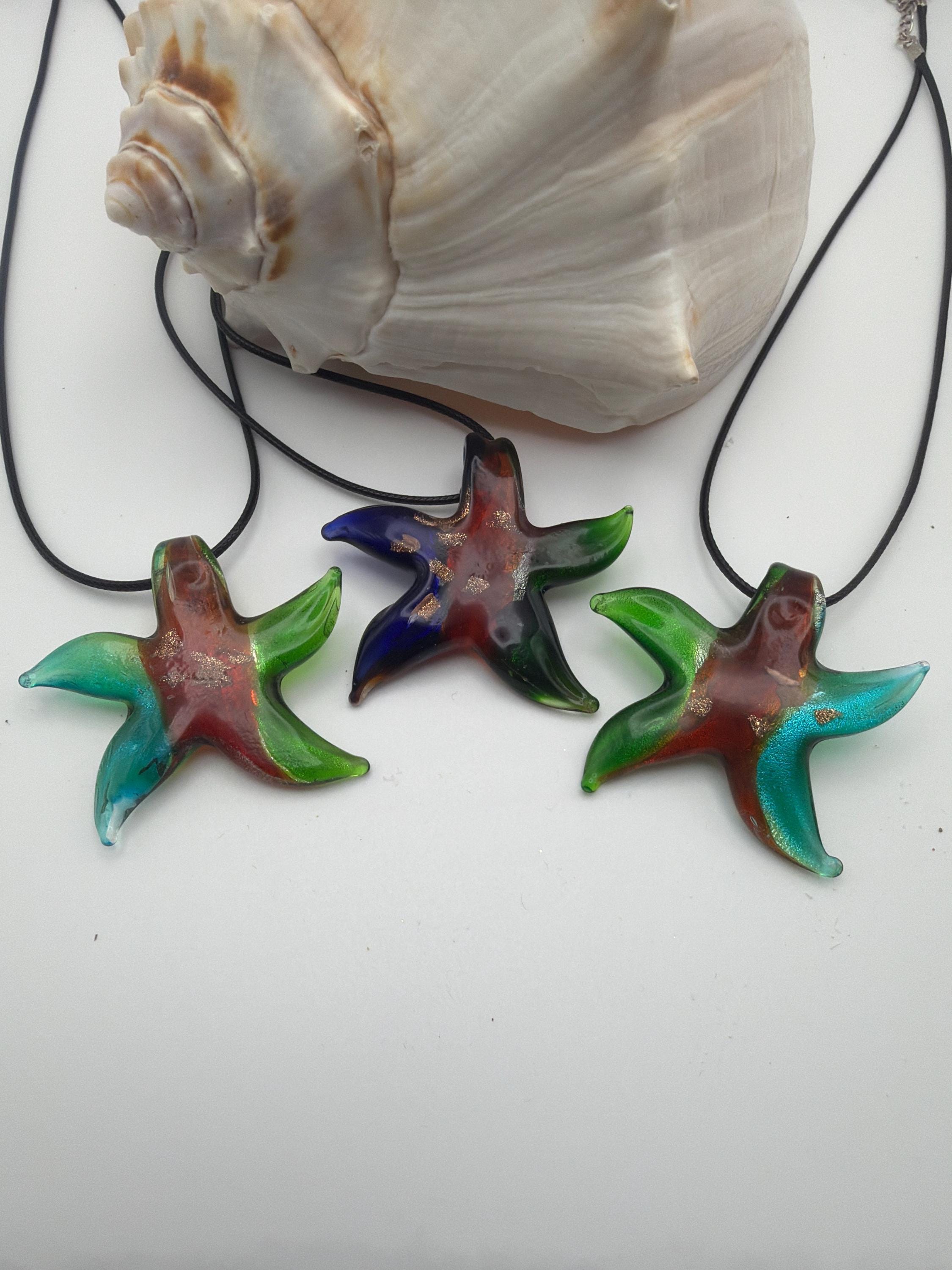 This necklace is made with a glass lampwork starfish pendant that has many lovely colors like blue, green, red and some gold accents.