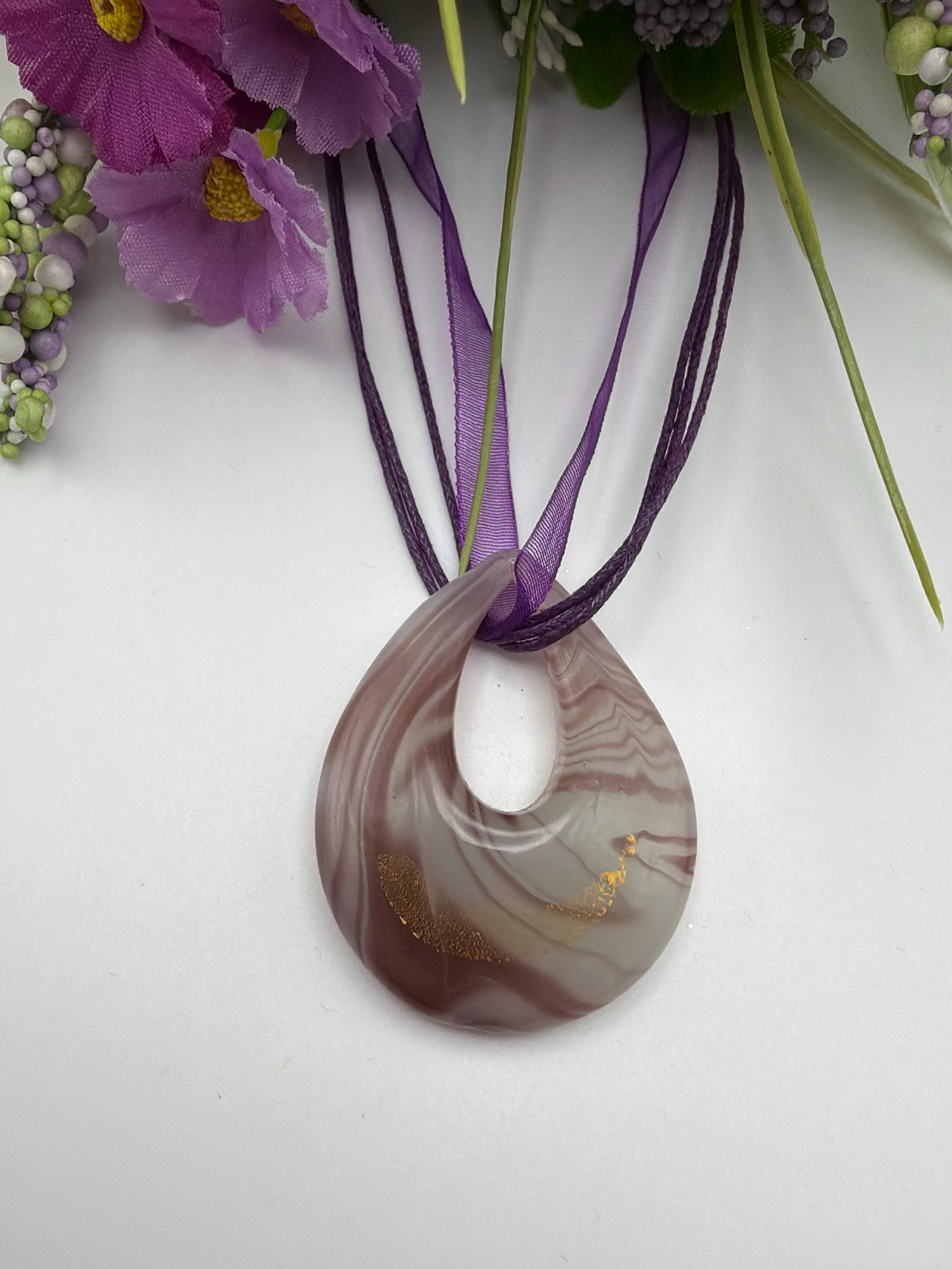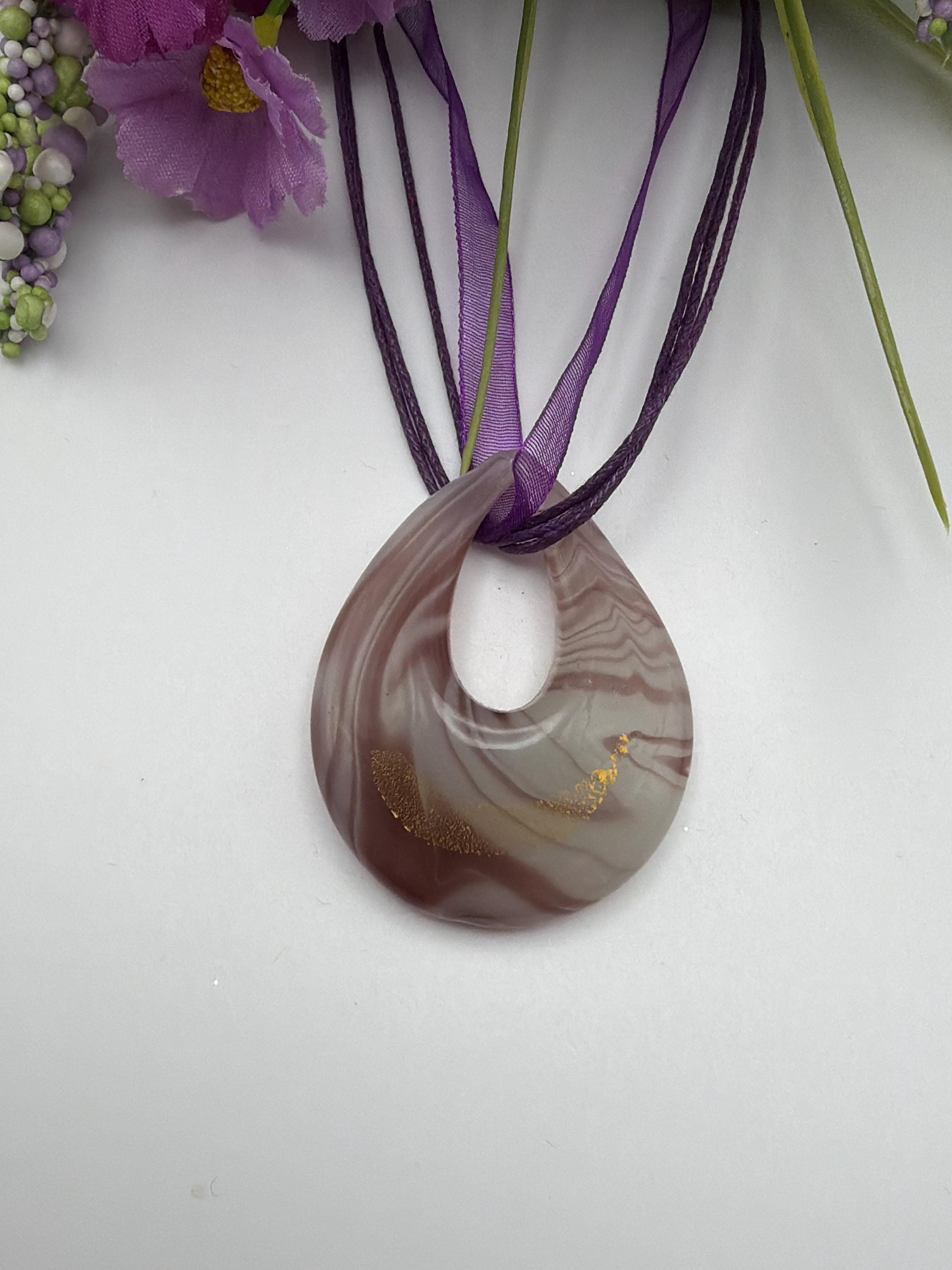 This necklace is made with a Lampwork pendant that is purple with white and gold colors accents