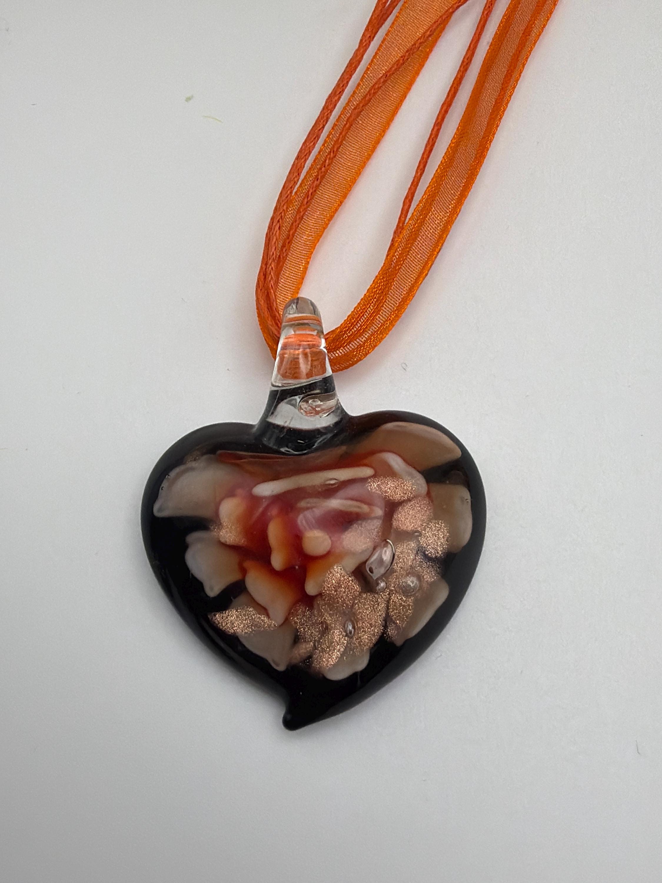 This necklace is made with a glass Lampwork orange heart and has a black background.