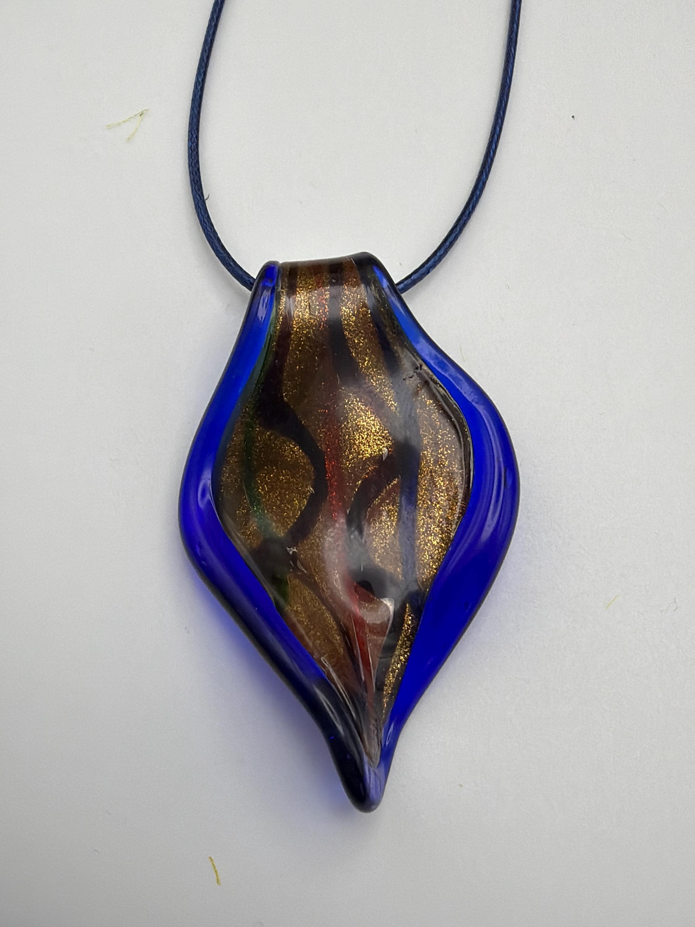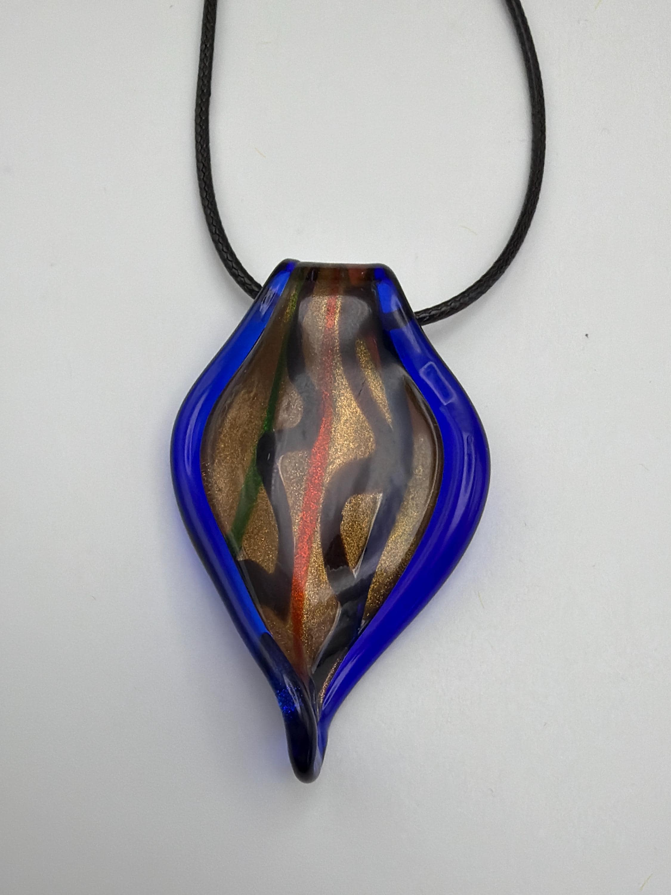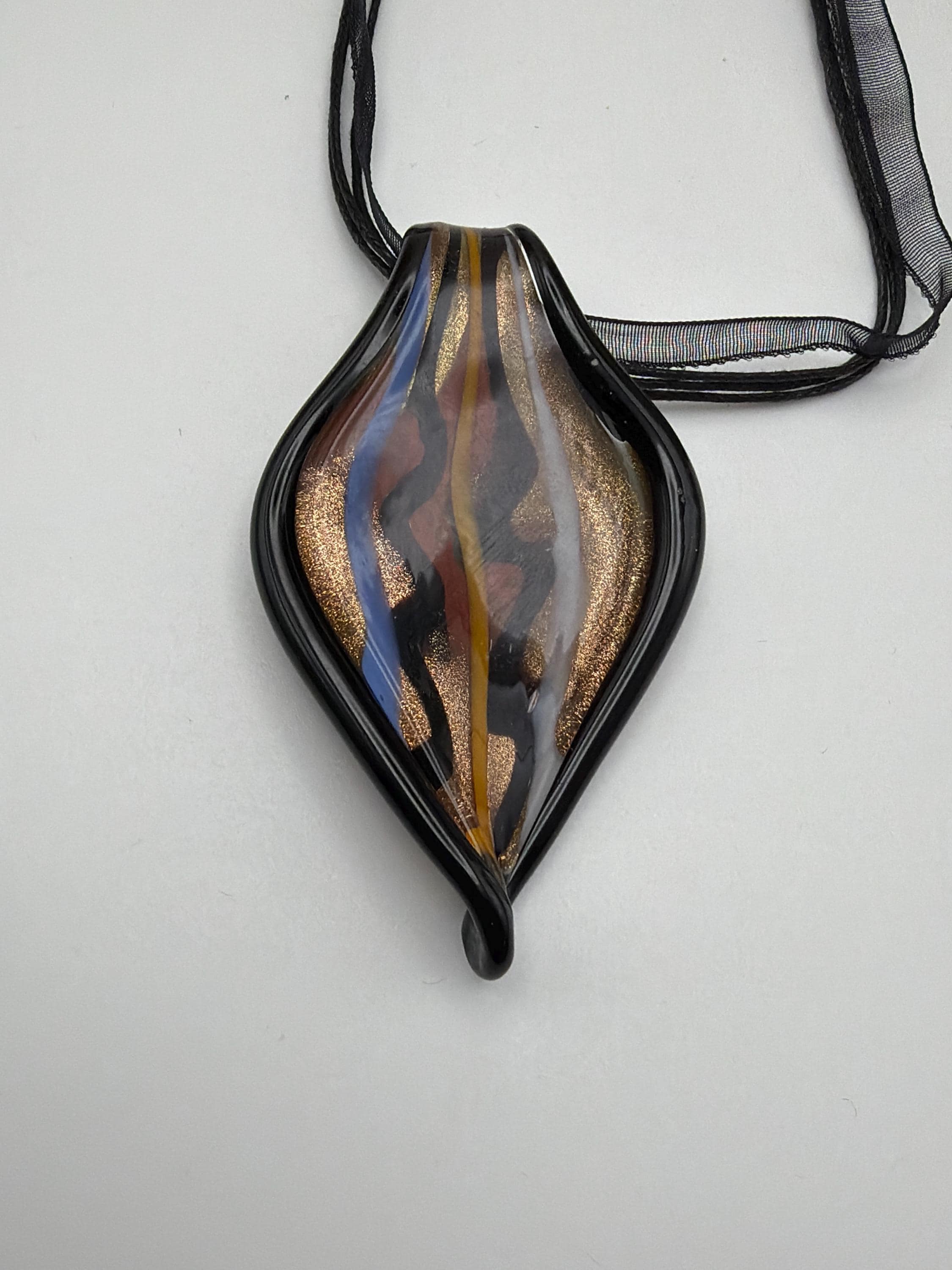 This necklace is made a glass leaf pendant with colors like black, gold, blue and white.