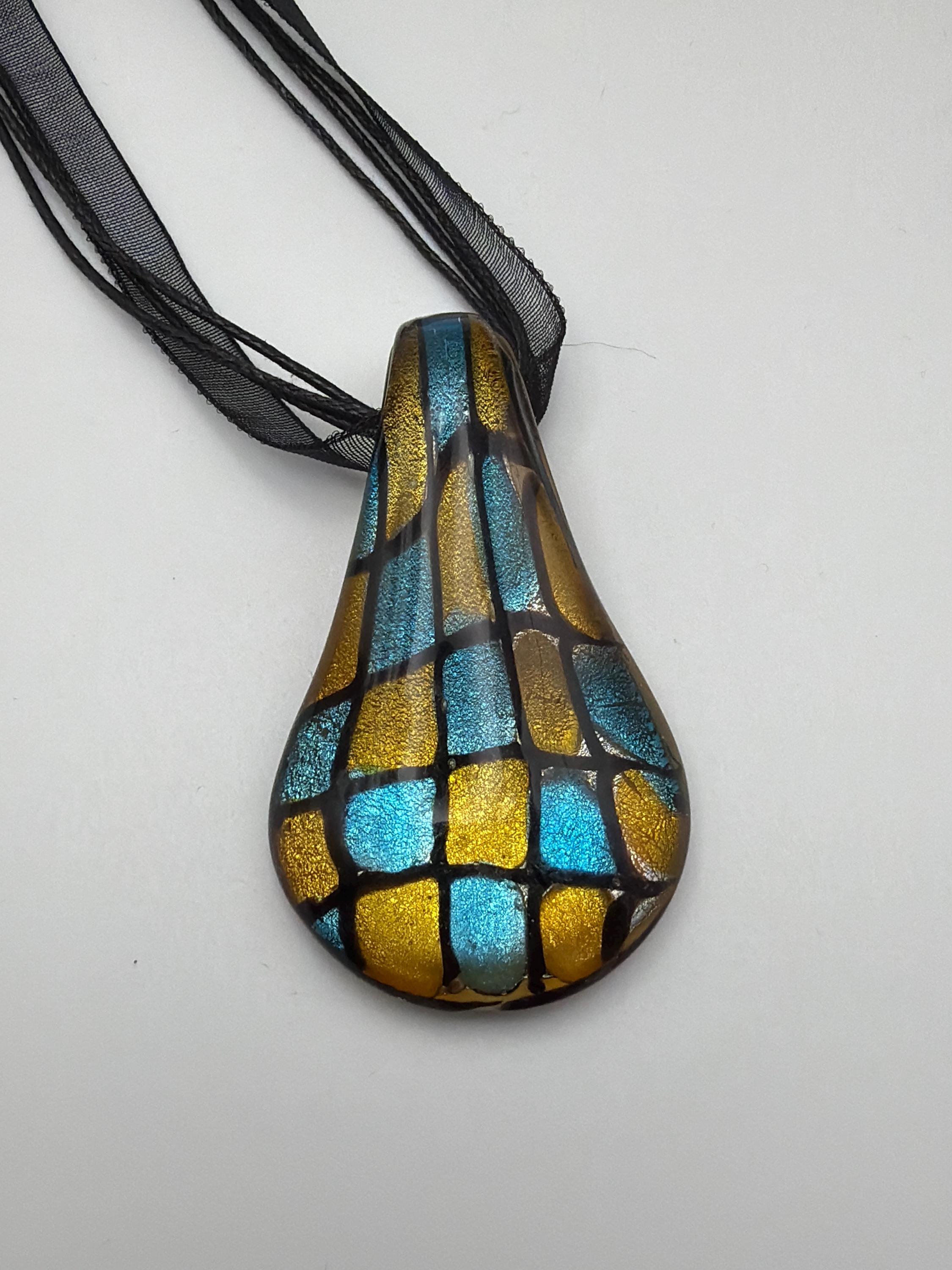 This necklace is made with a checkered drop glass pendant. It has a blue, gold and black colors.
