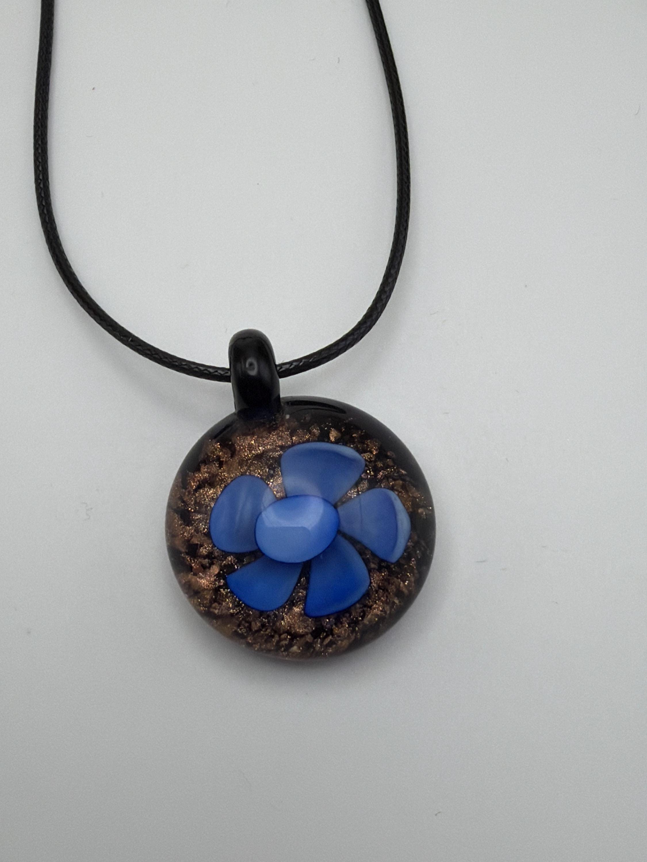 This necklace is made with a glass Lampwork flower that is blue but does have some gold accents and has a black background.