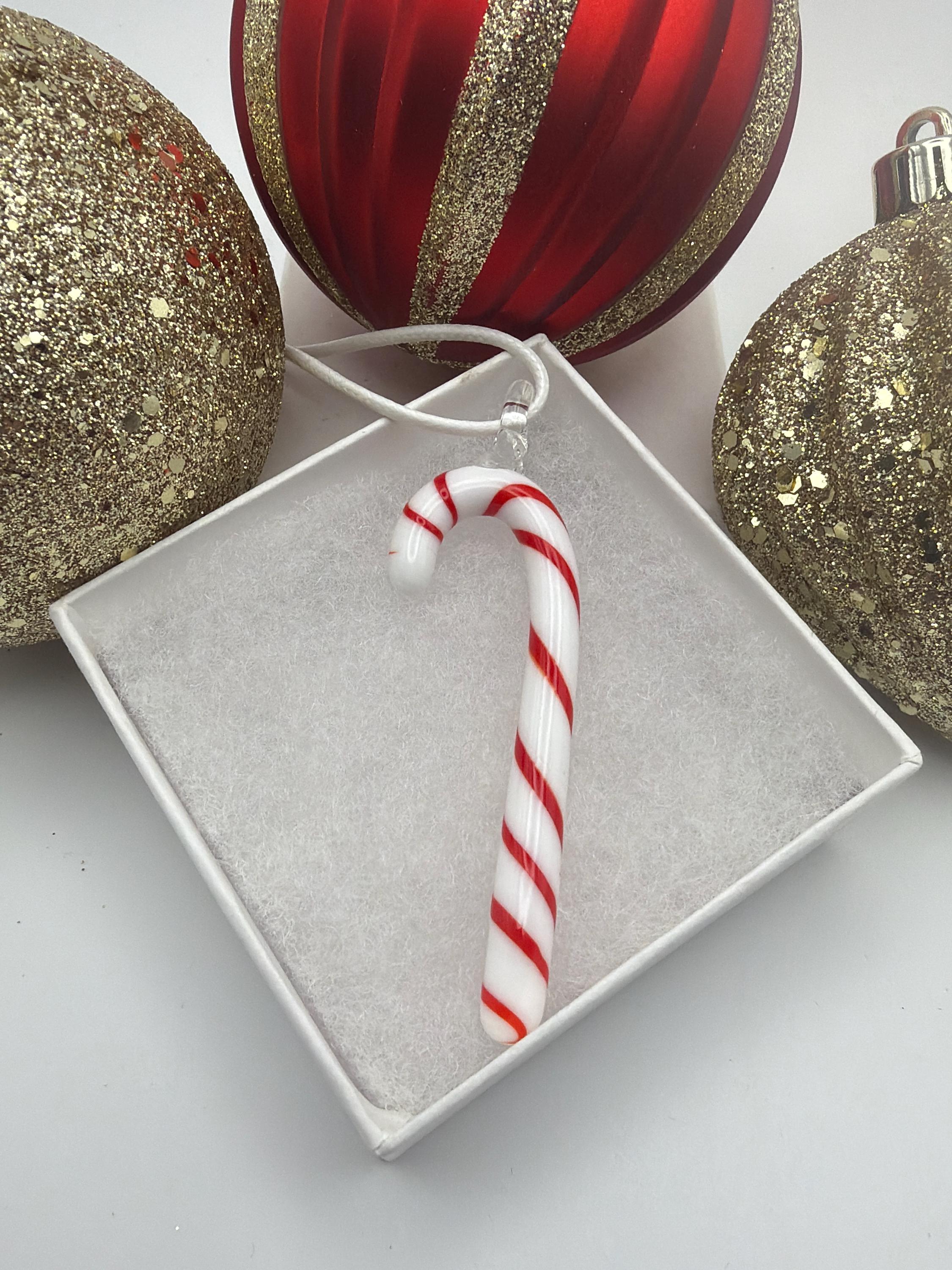 This necklace is made with a glass candy cane pendant that is red and white in color.