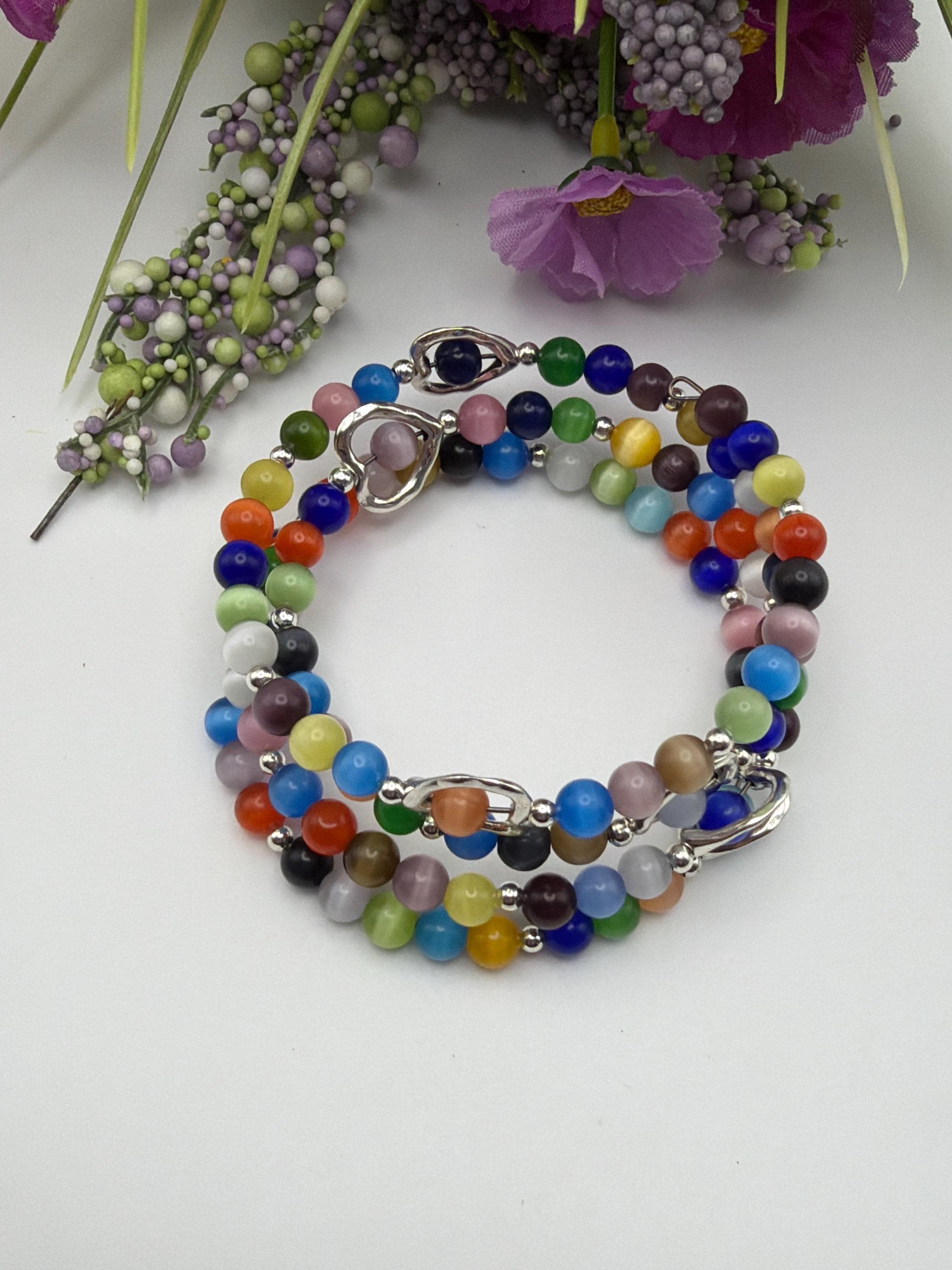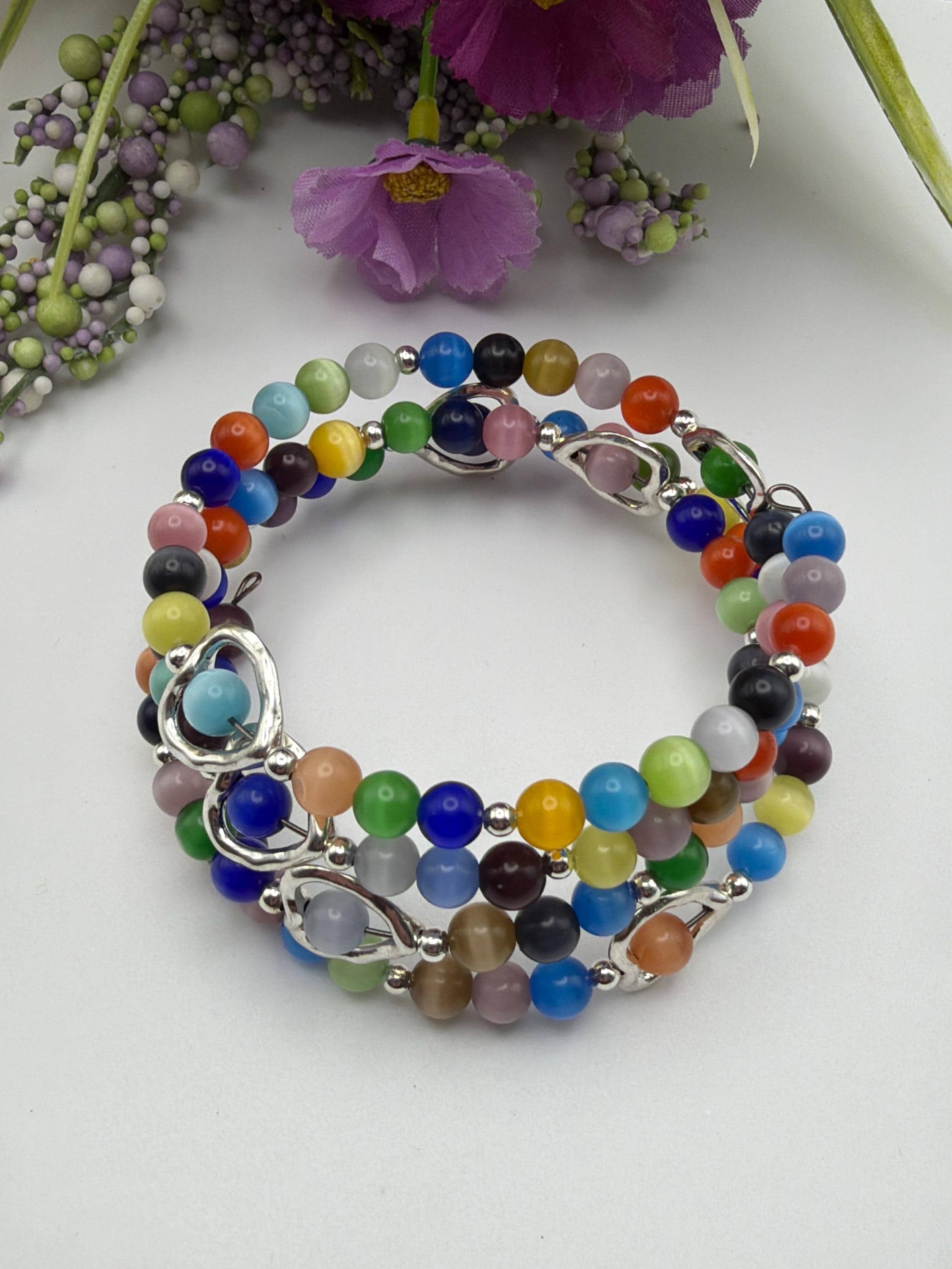 🎨 Introducing our Cats Eye Memory Wire Bracelet 💫 - a vibrant and colorful accessory that's perfect for those who love to express their personality through their jewelry! This Multi-Color Colorful Bead Bracelet 🎨 features a variety of colorful beads, including cats eye beads, silver beads and heart spacers that create a stunning and eye-catching piece that's sure to turn heads.