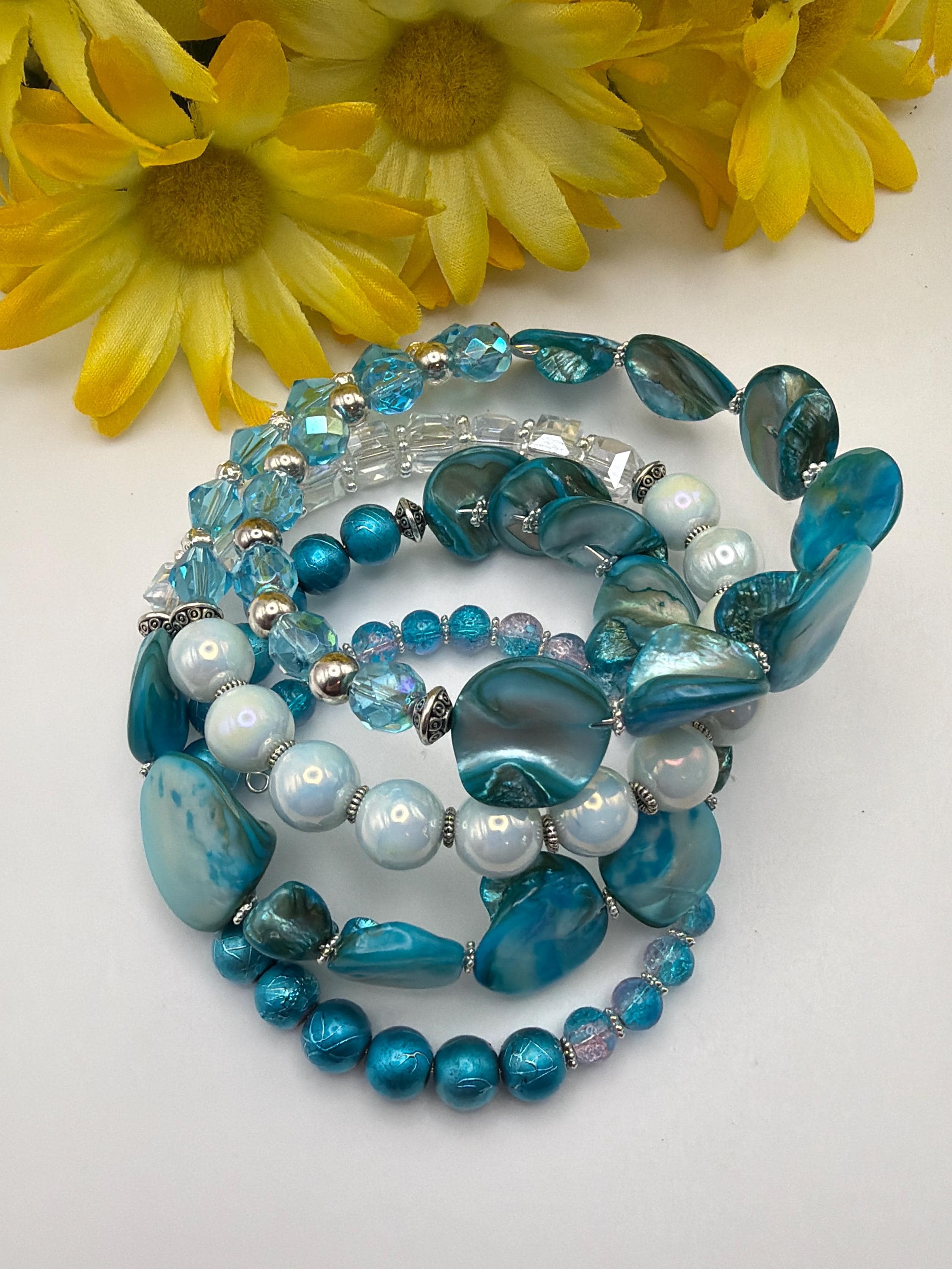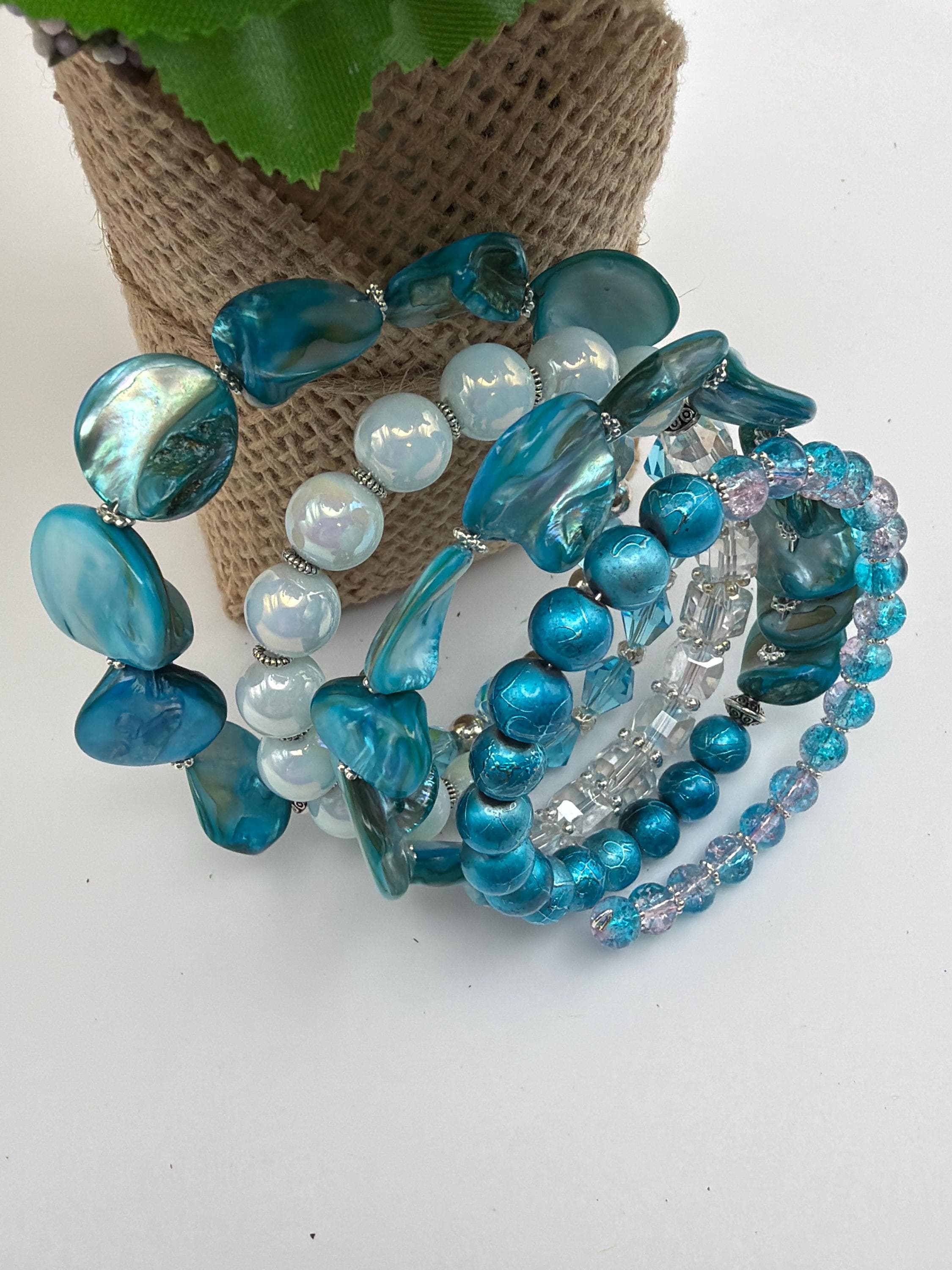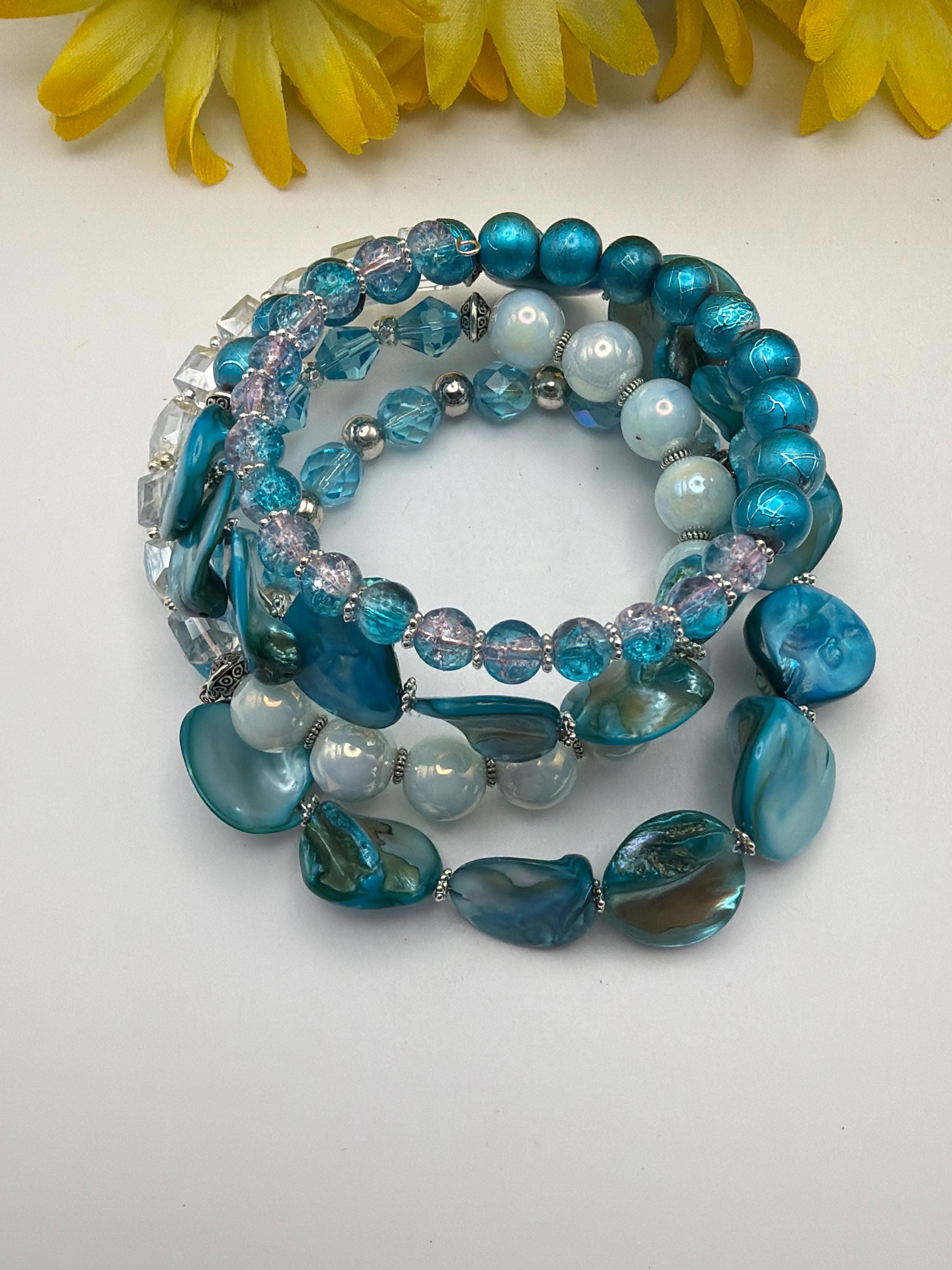 Blue Shell & Aqua Chip Memory Wire Bracelet | Multi-Strand Bracelet