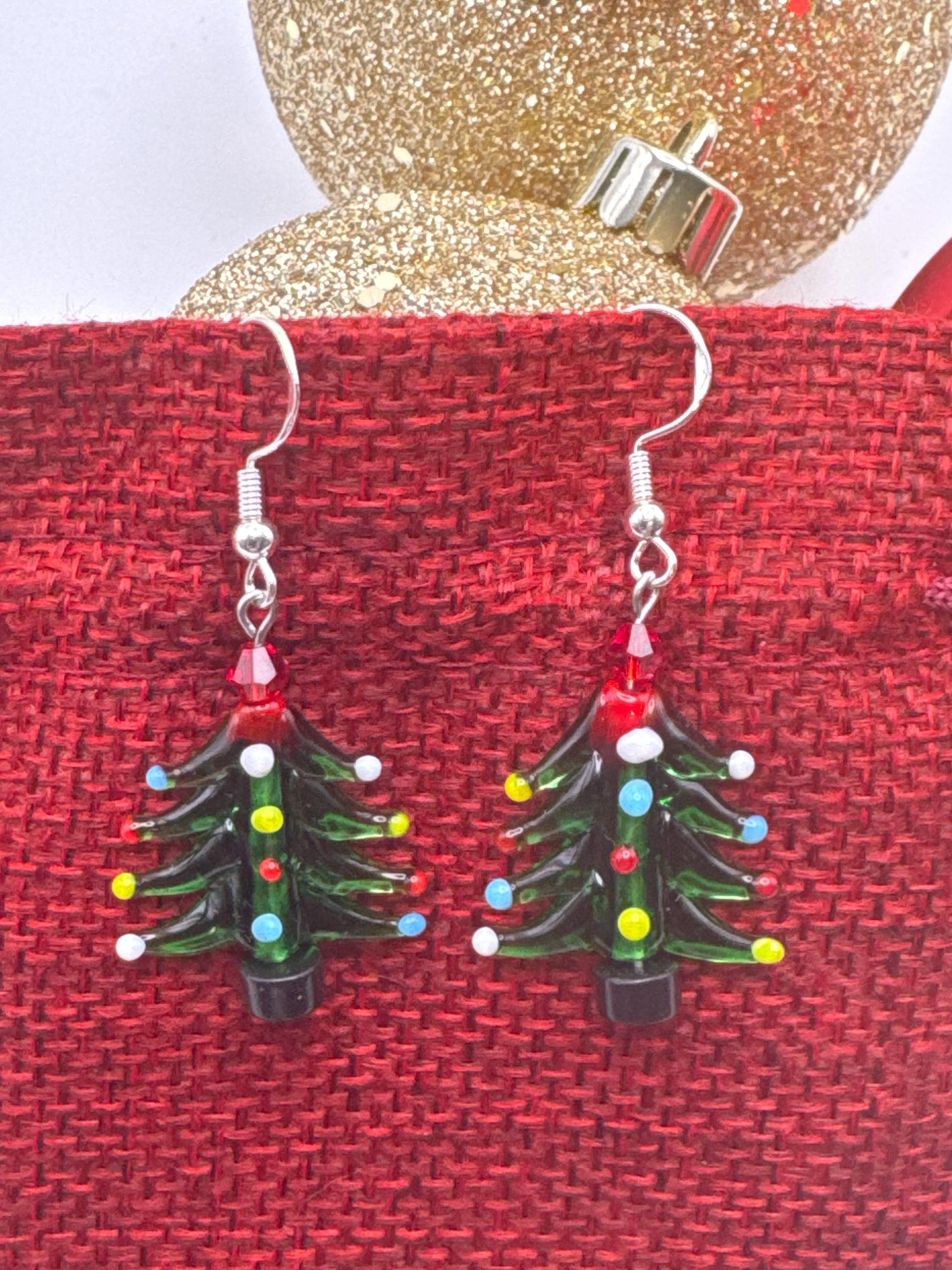 These earrings are made with Lampwork glass Christmas trees, black Jasper bead and red a faceted bead.