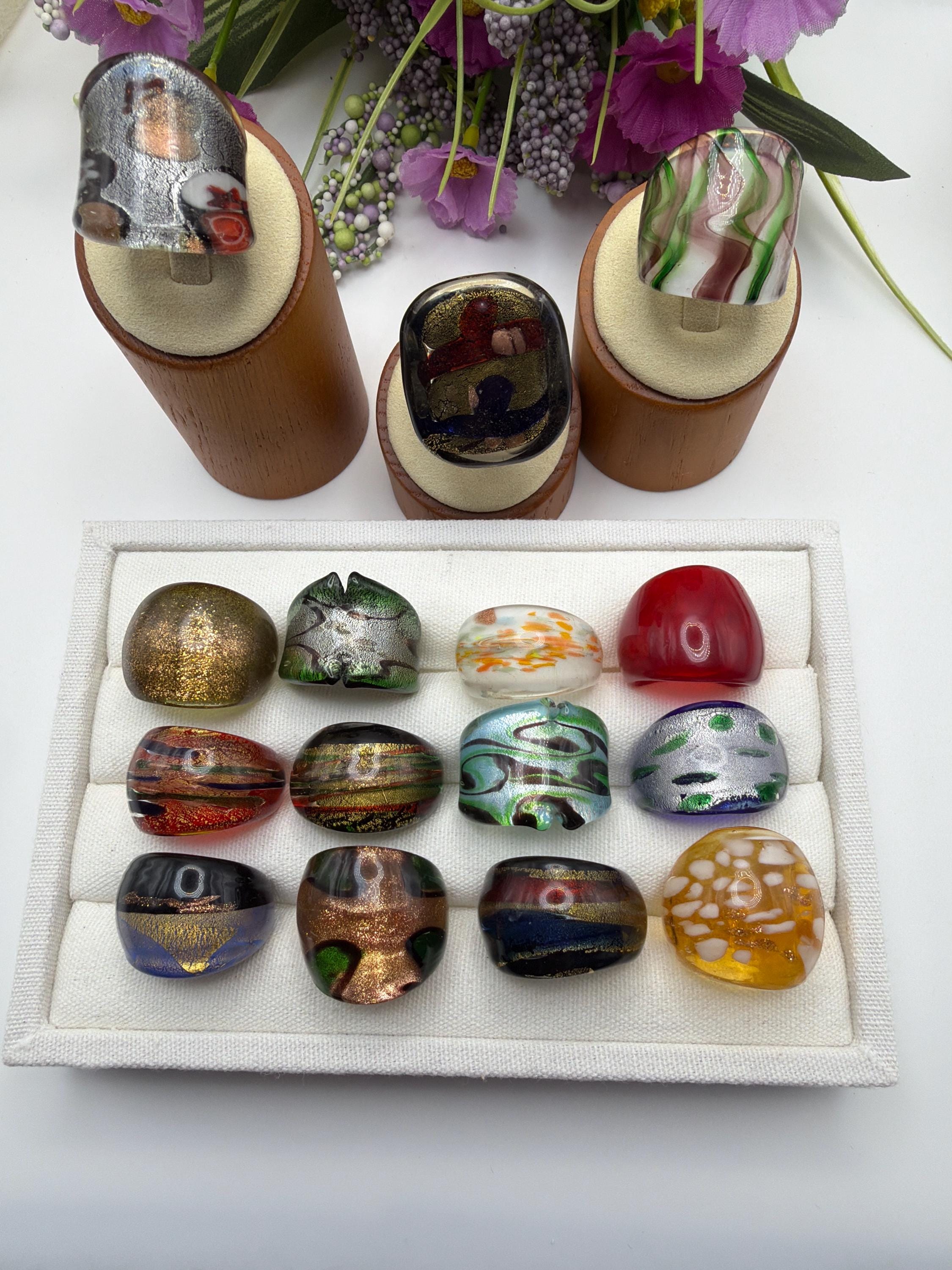 There will be lots of options by style, color and type of ring. There will be Millefiori designs and Murano Inspired glass rings to choose from.