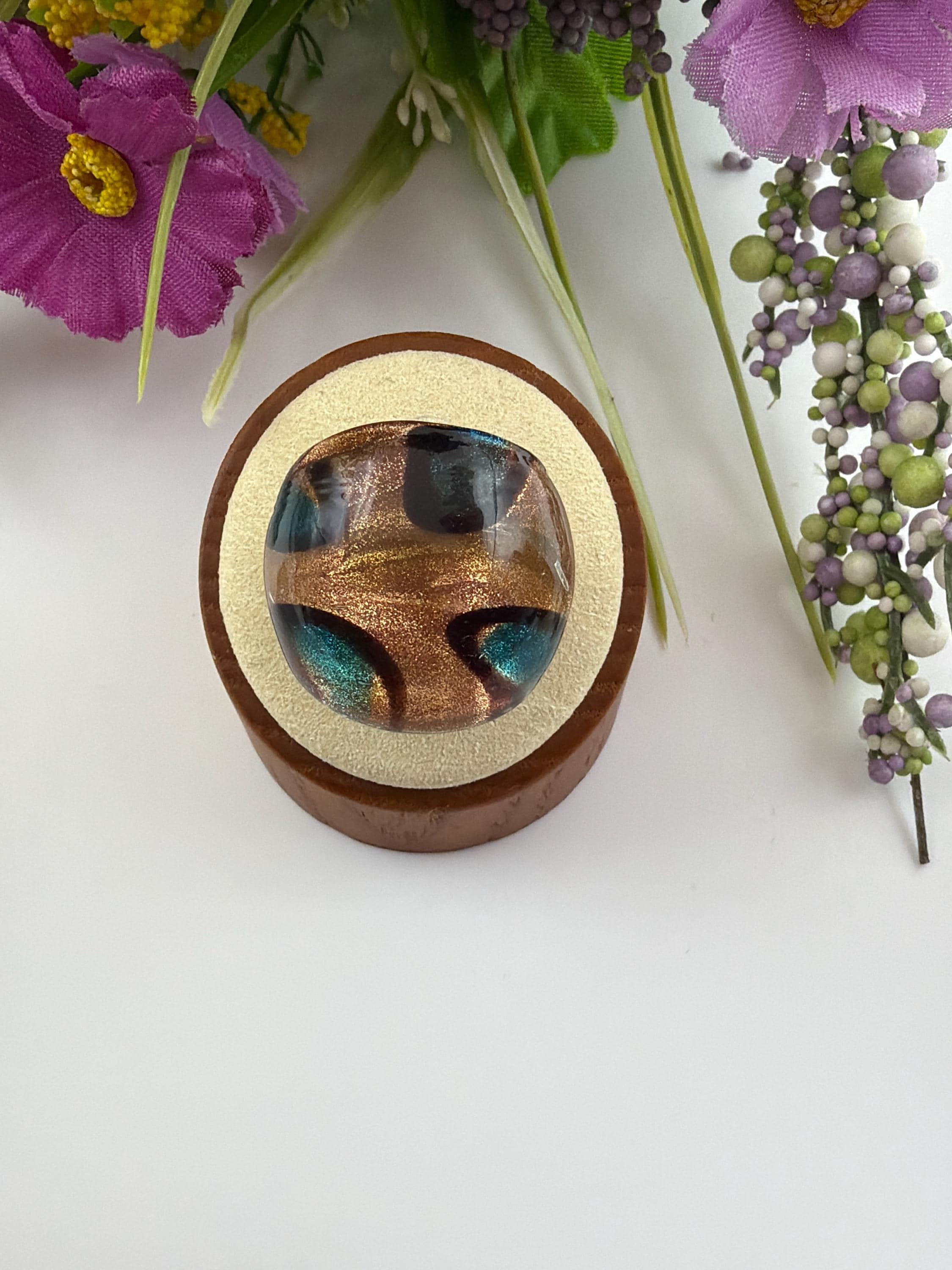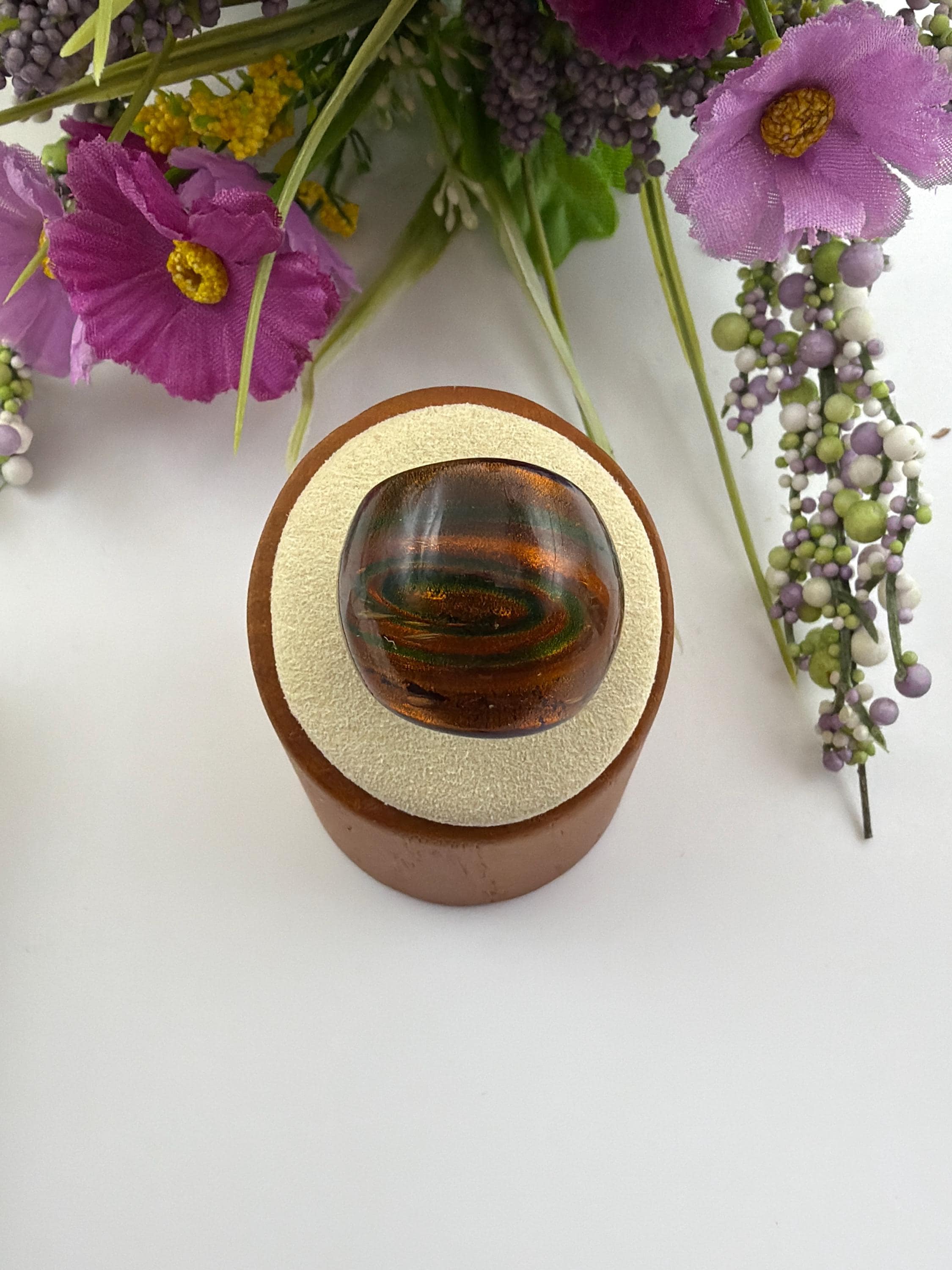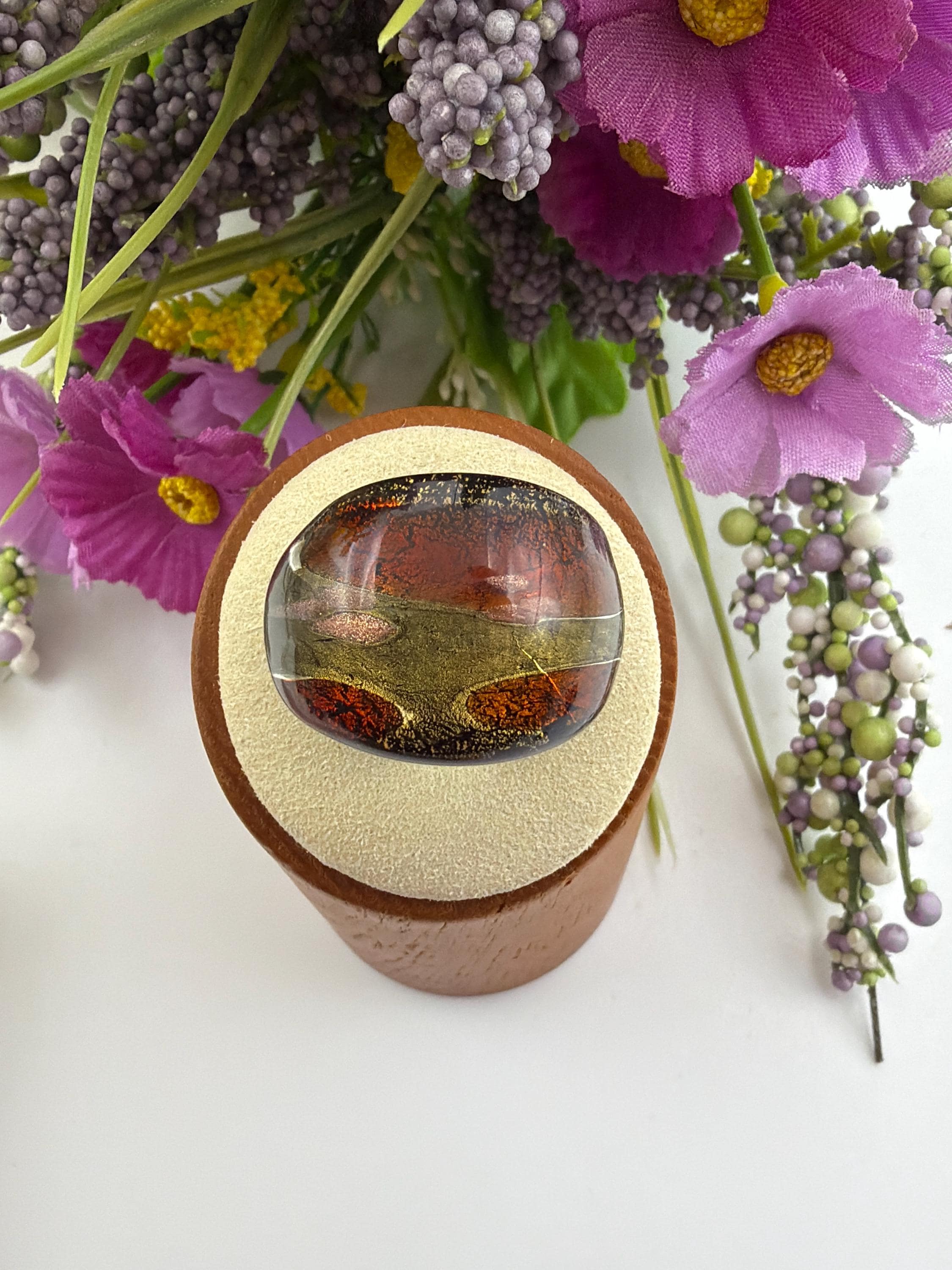 Très jolie bague en verre de couleur dorée avec un beau design! Un bijou très original! Je remercie ss créatrice, Chantal, Montréal