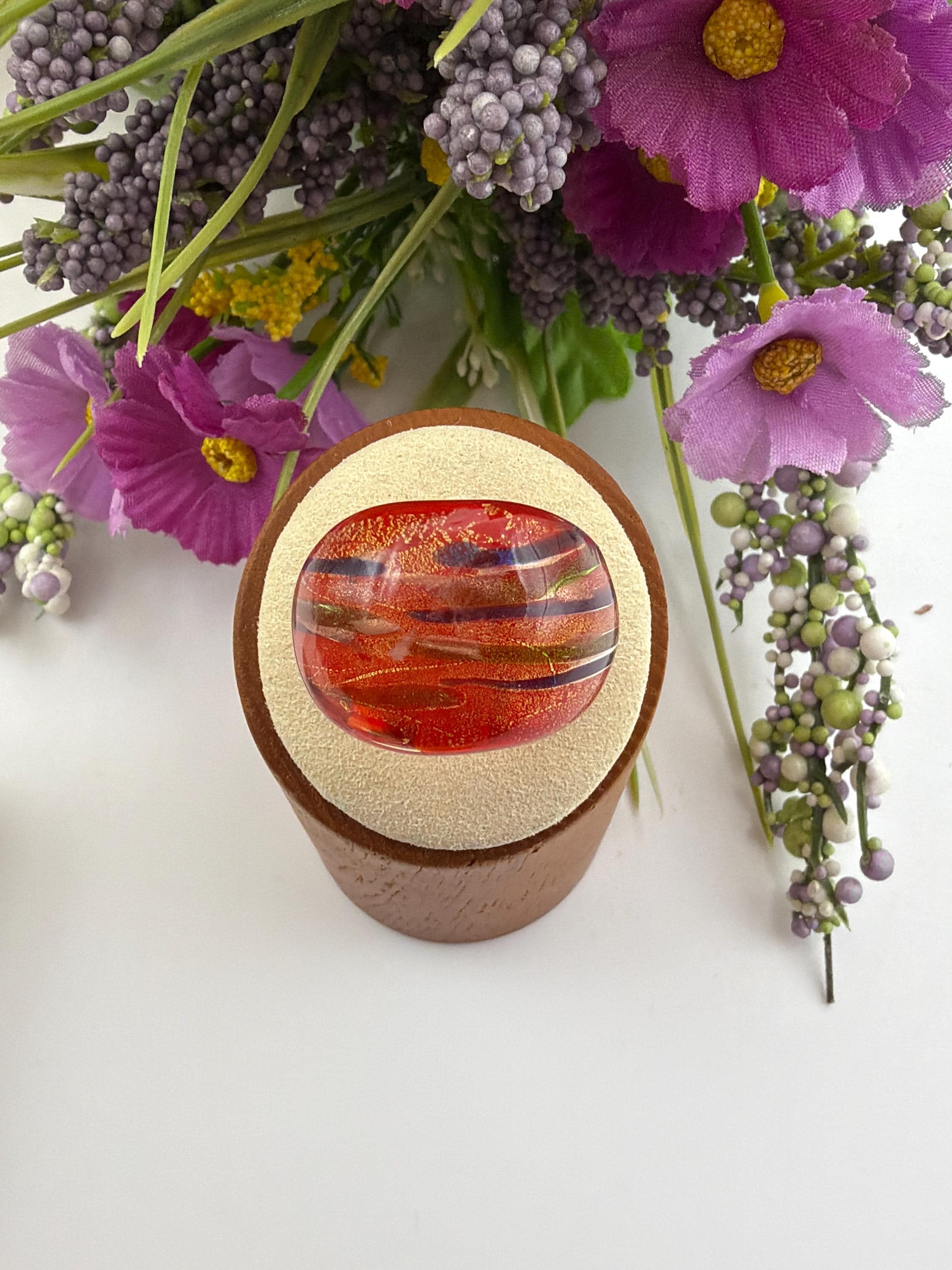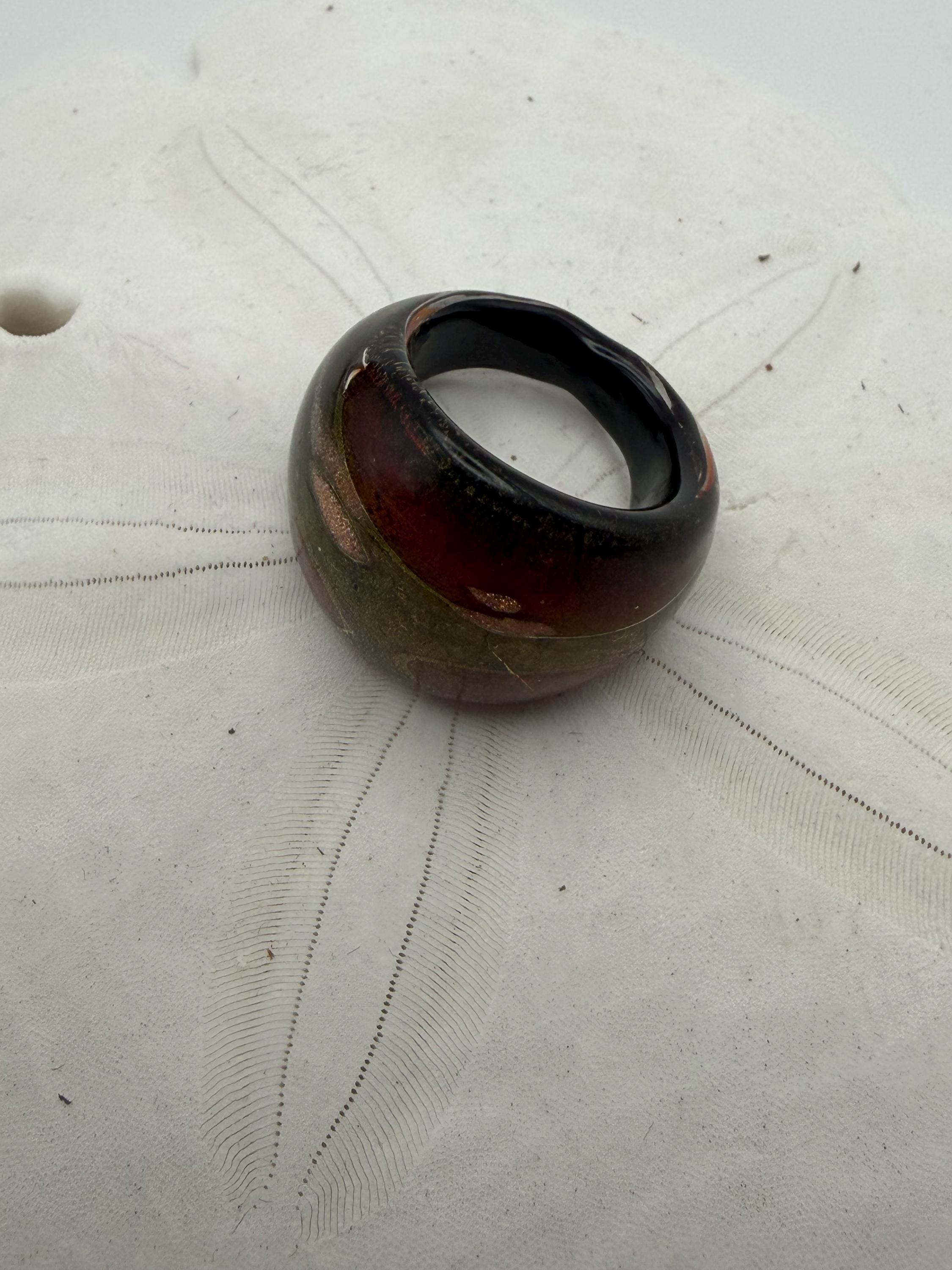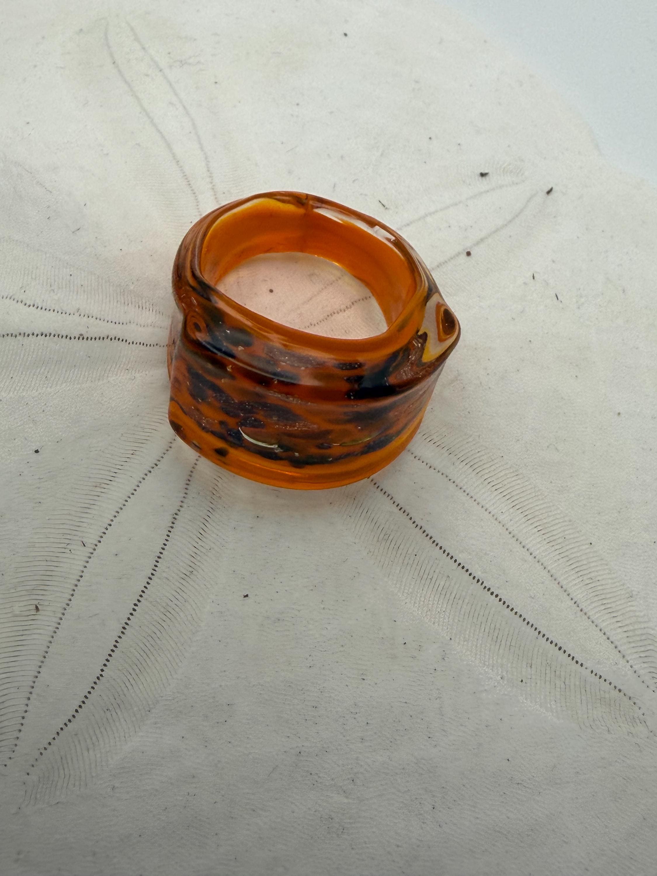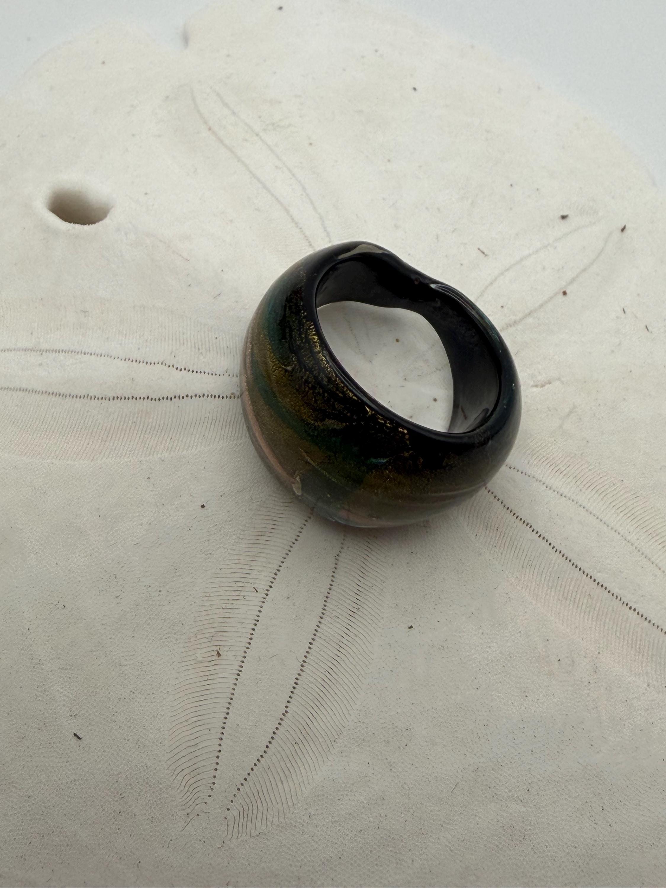 Très jolie bague en verre de couleur dorée avec un beau design! Un bijou très original! Je remercie ss créatrice, Chantal, Montréal
