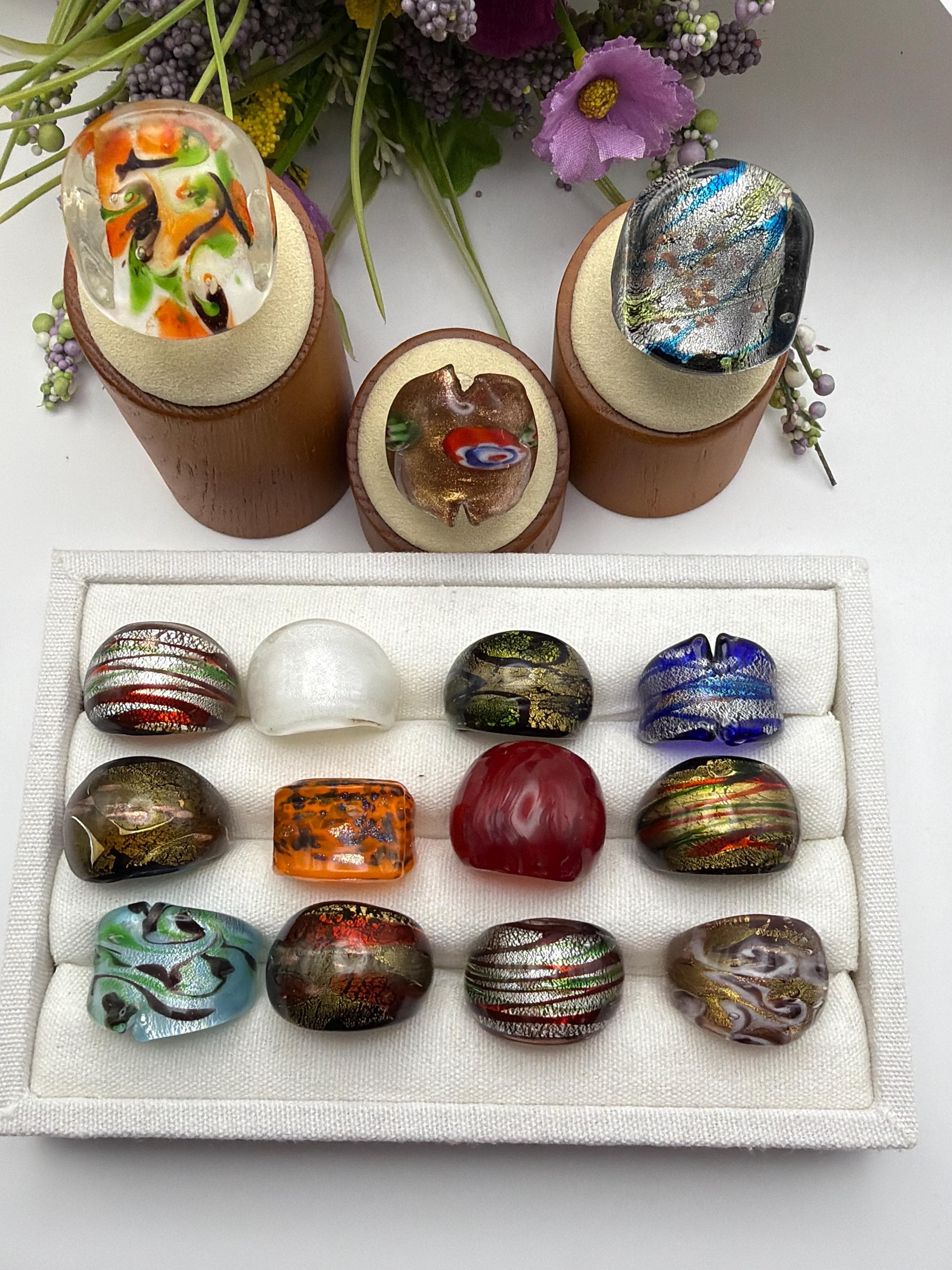 There will be lots of options by style, color and type of ring. There will be Millefiori designs and Murano Inspired glass rings to choose from.