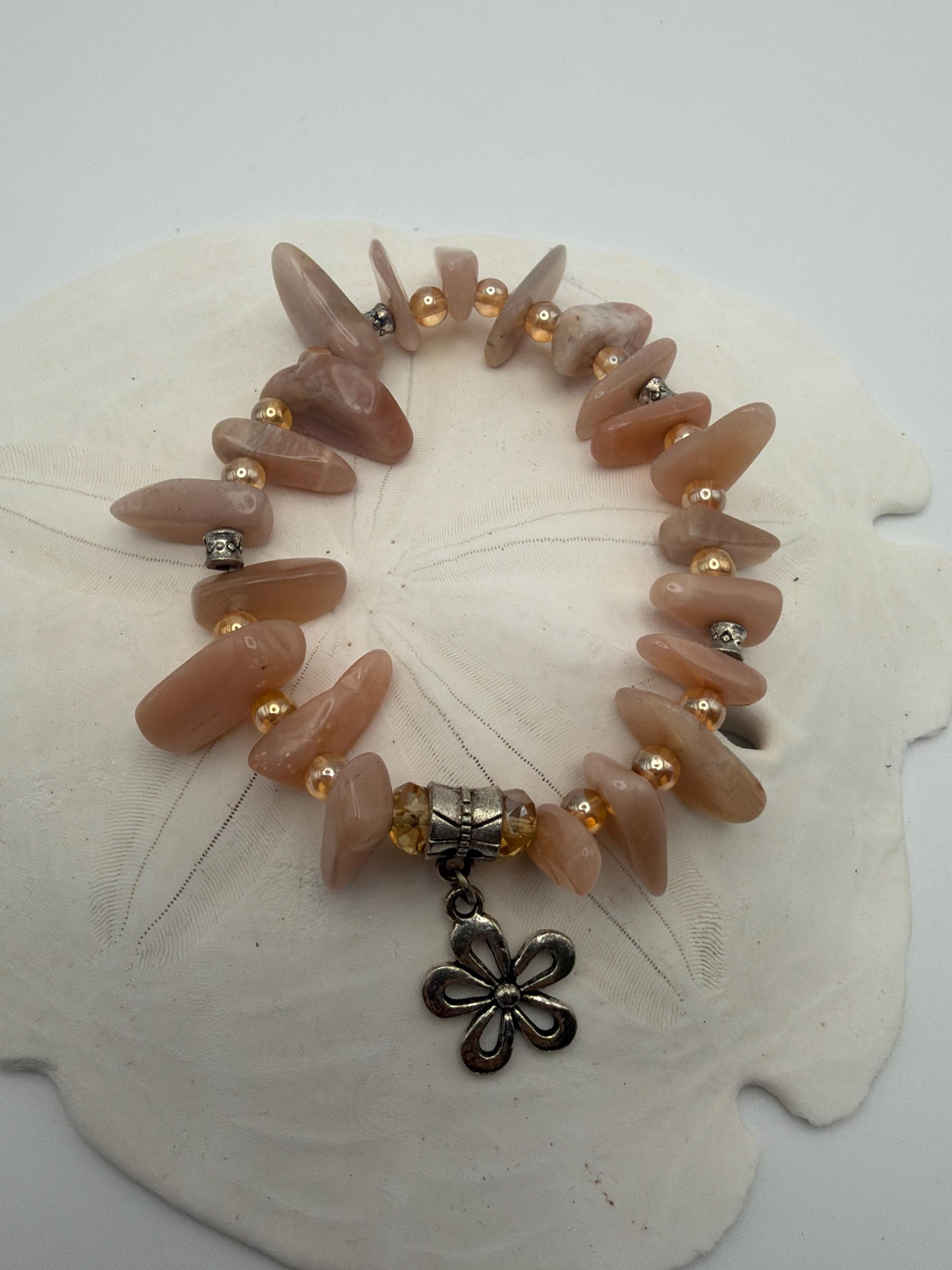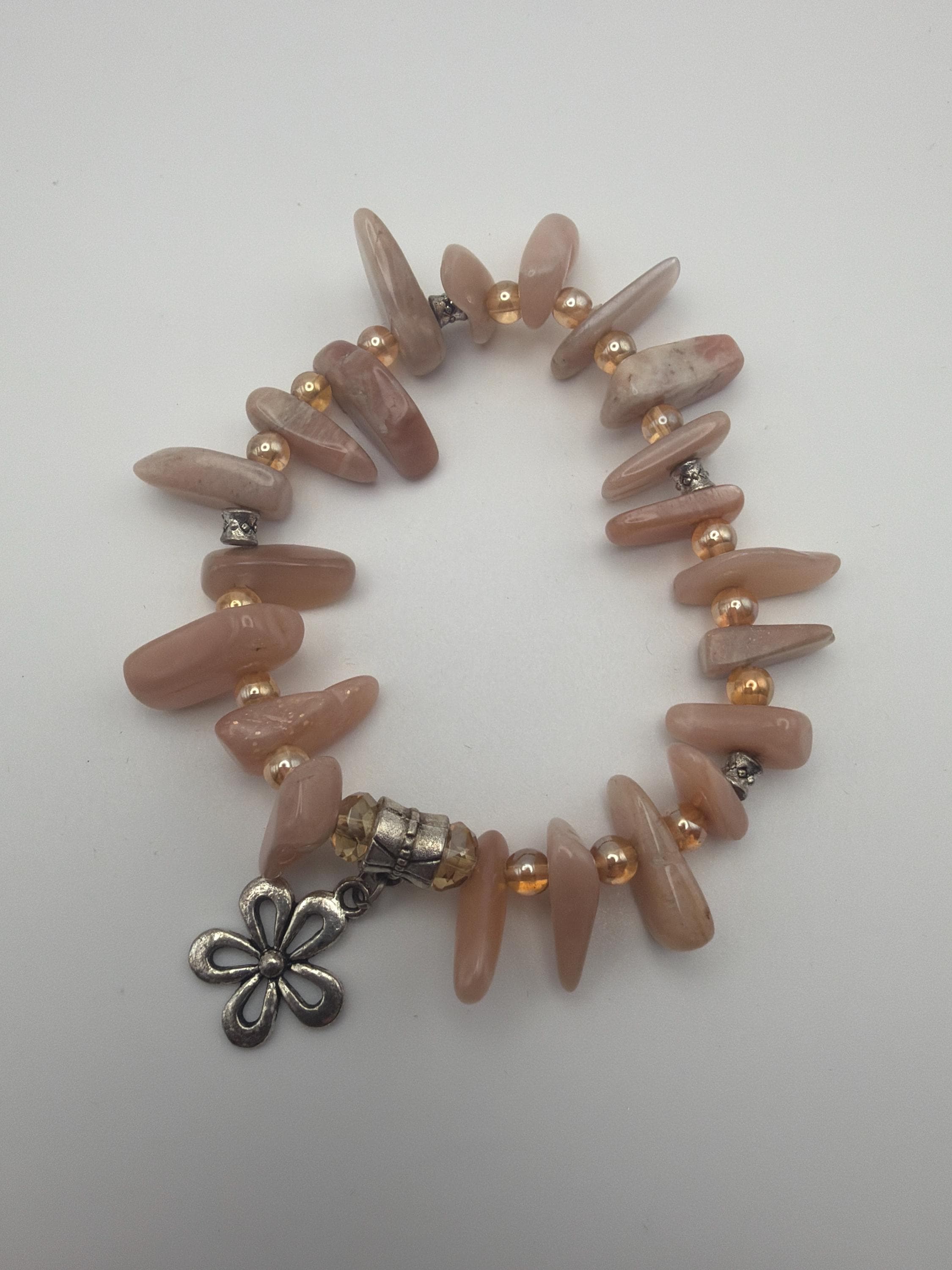 🌸 This bracelet is made with pink moonstone beads and has a flower charm
