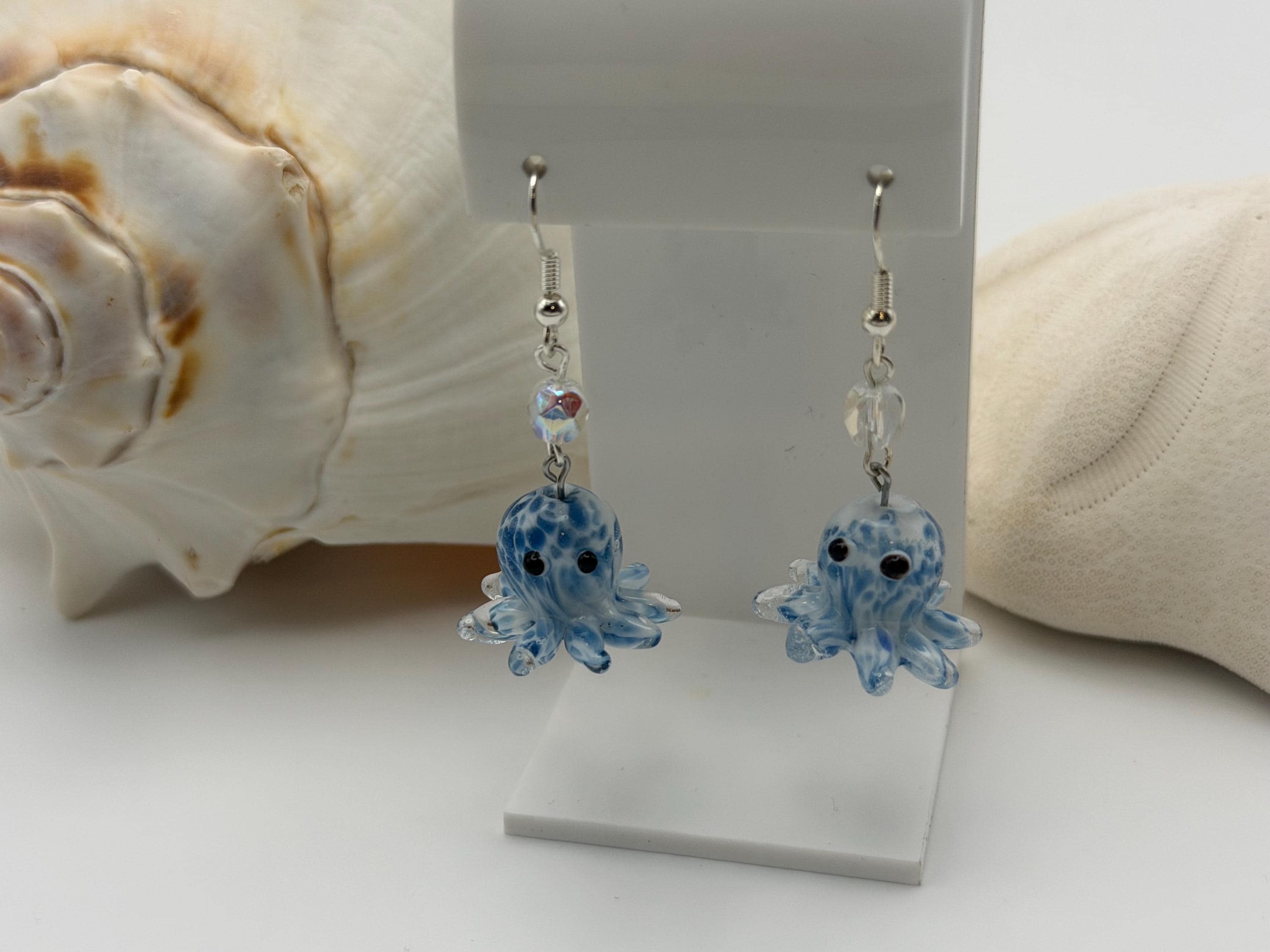 These earrings are made with Lampwork glass octopus beads and a Ab glass faceted bead and they are super cute and not heavy at all.