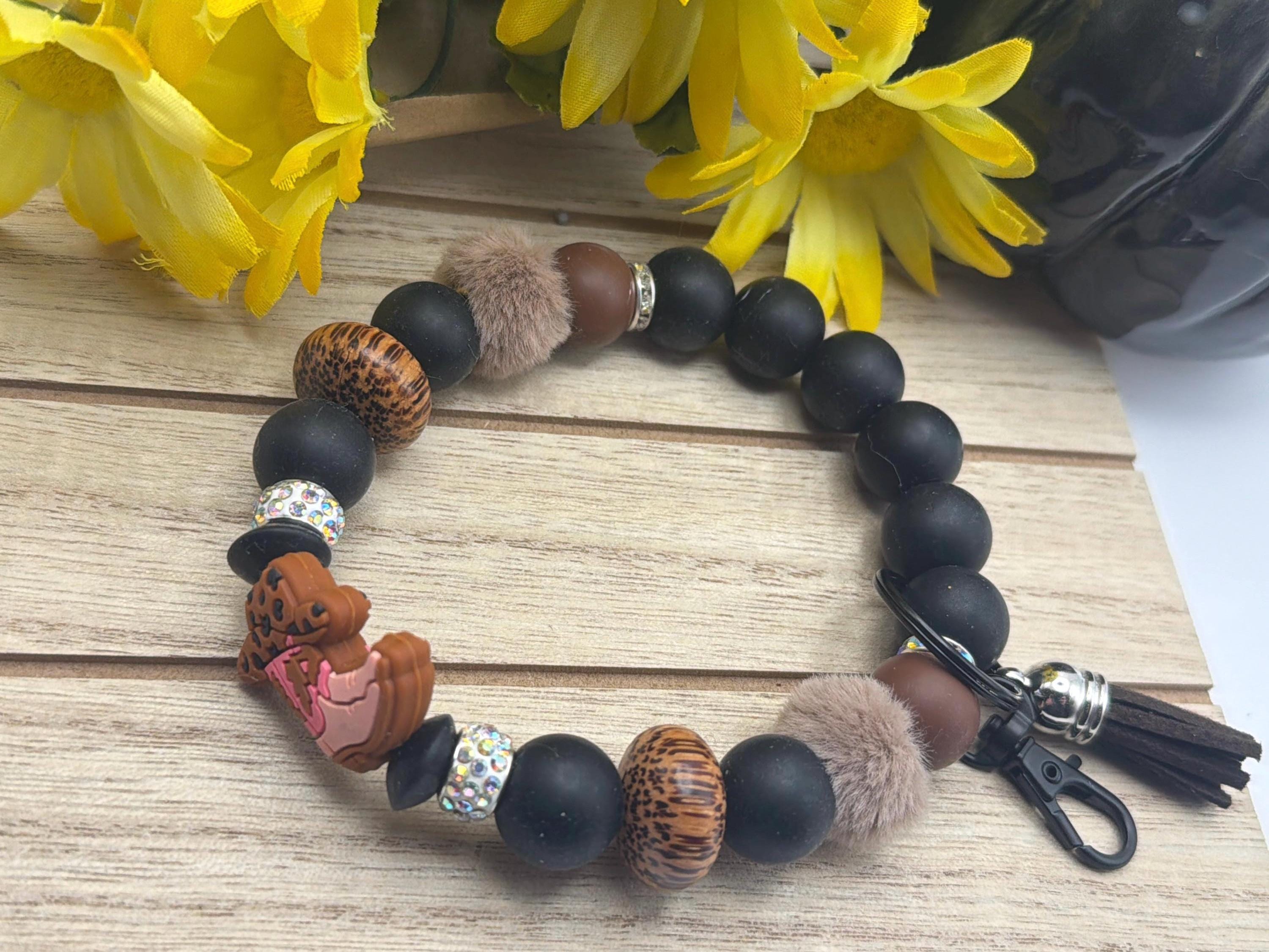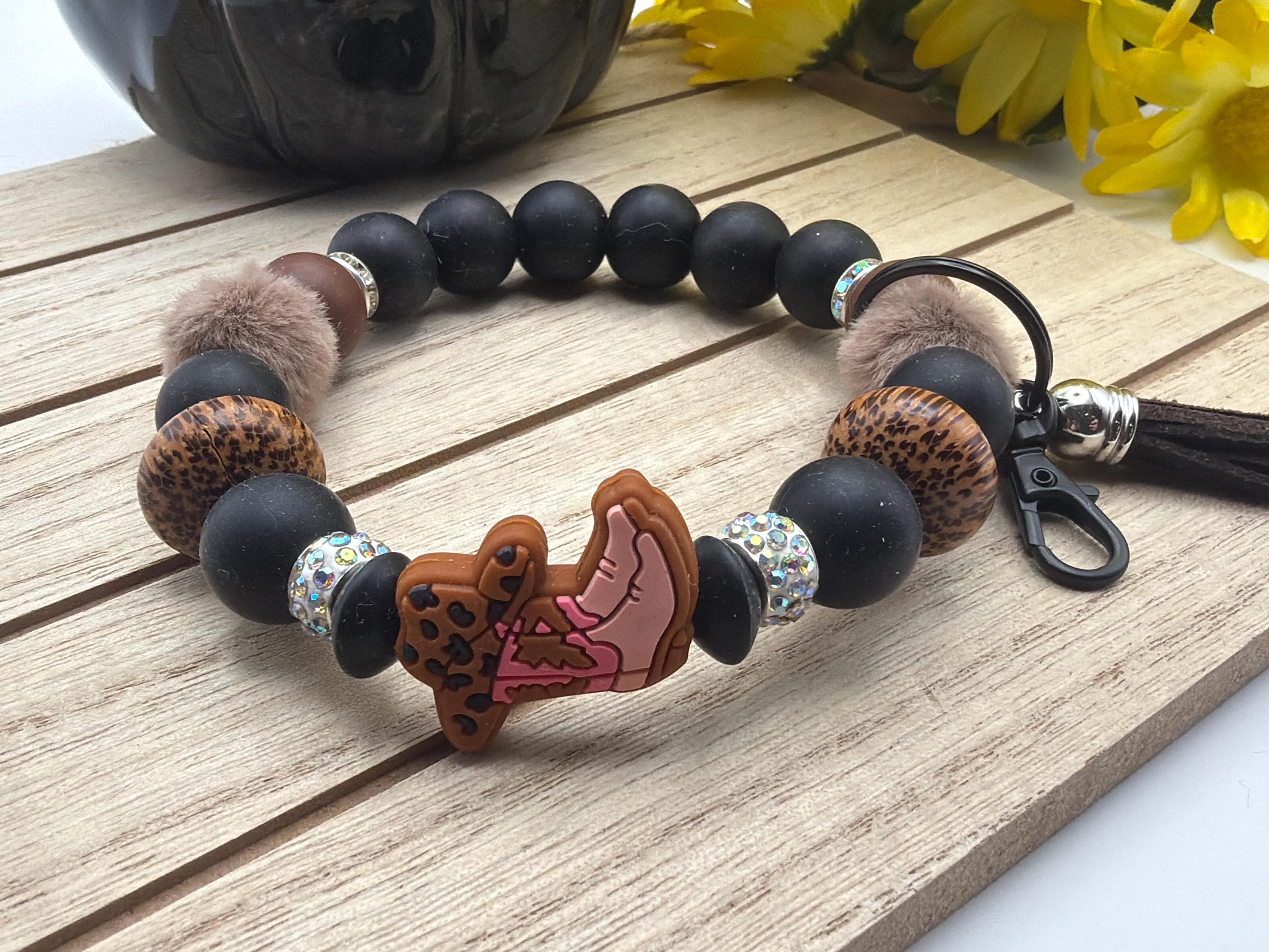 This wristlet is made with silicone beads and has a tassle. They are a great gift for someone or for you to brighten up your keychain or to hold your key fob.