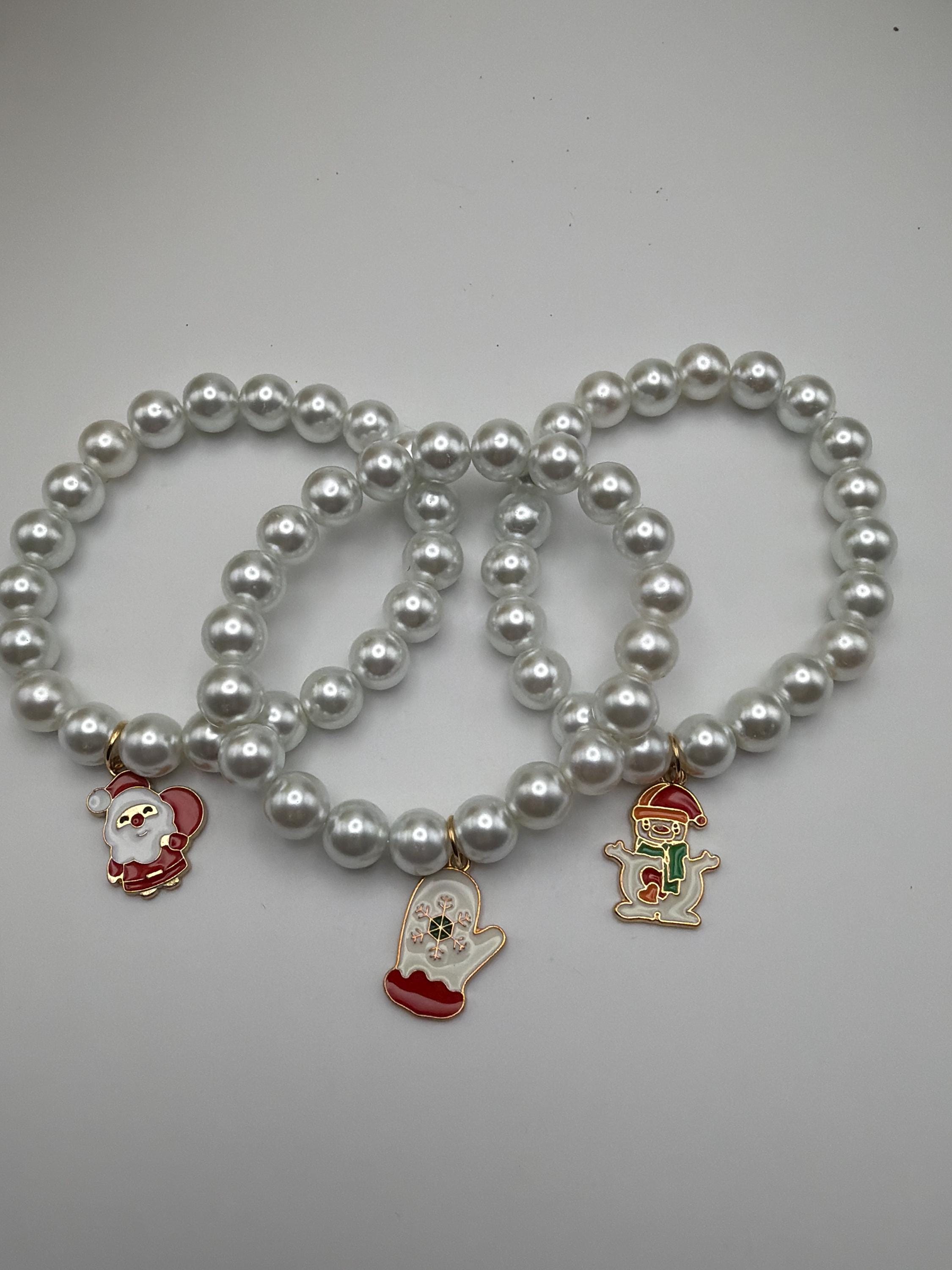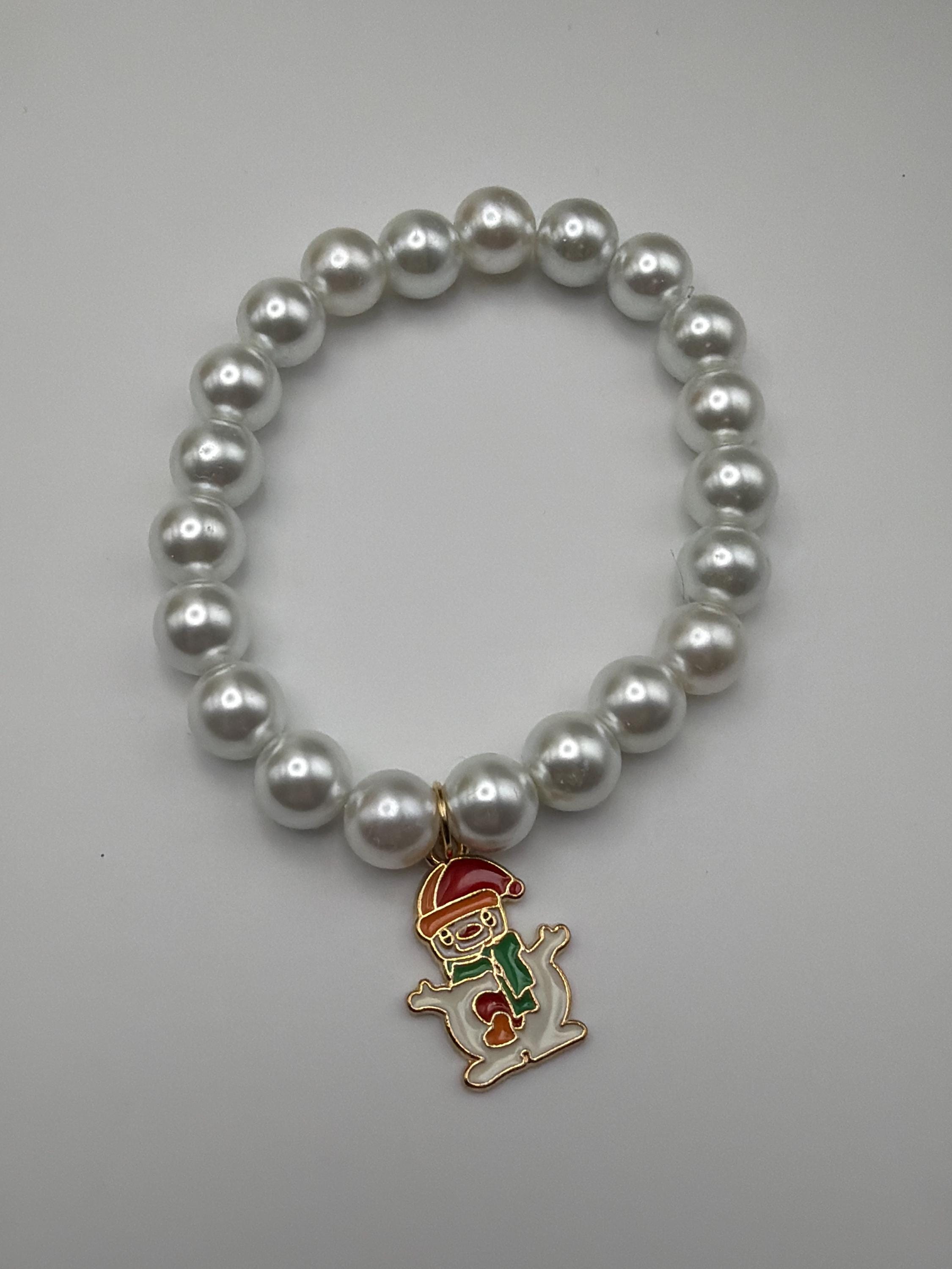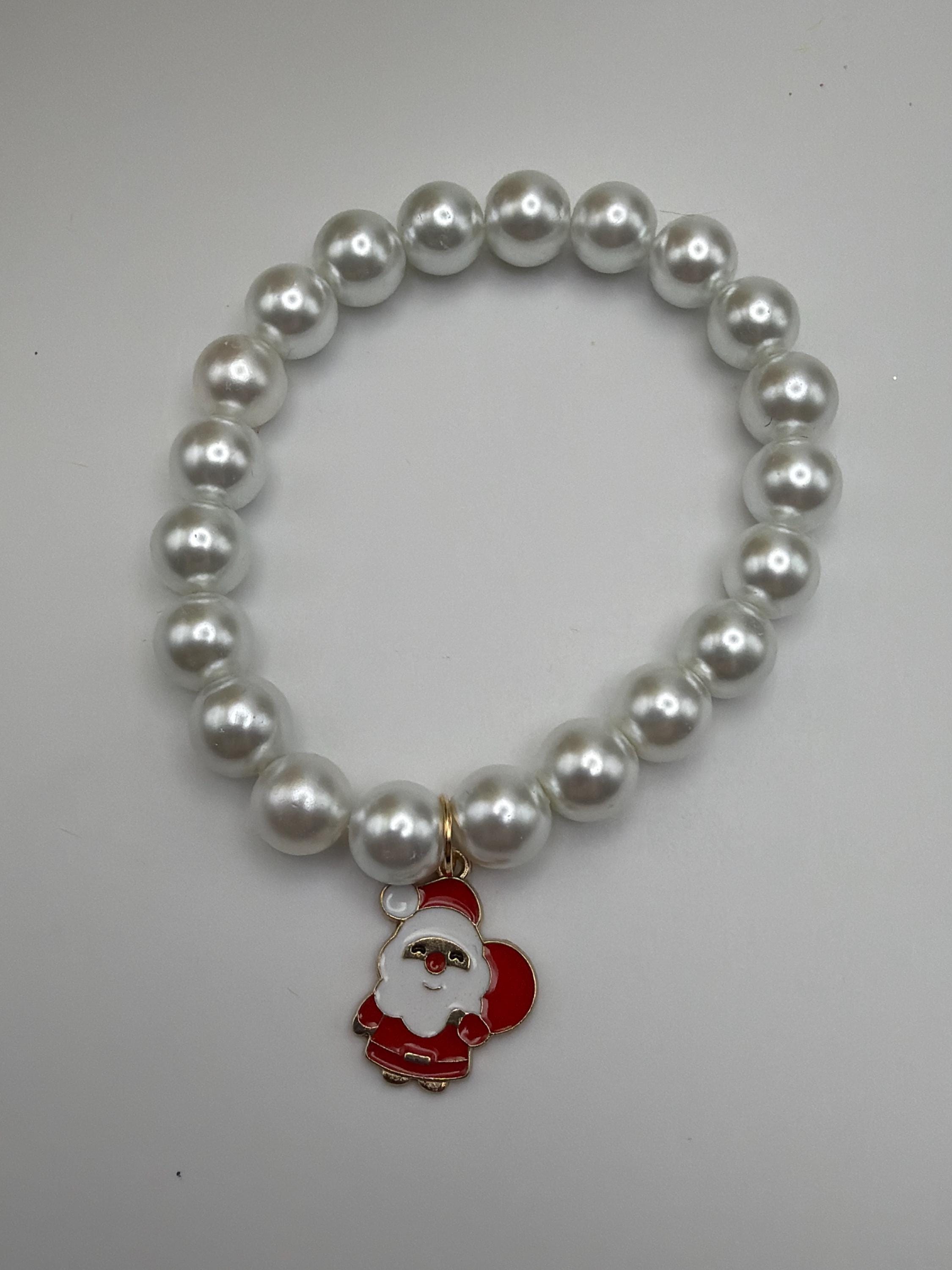 This bracelet is made with white pearl beads and has a Christmas charm.