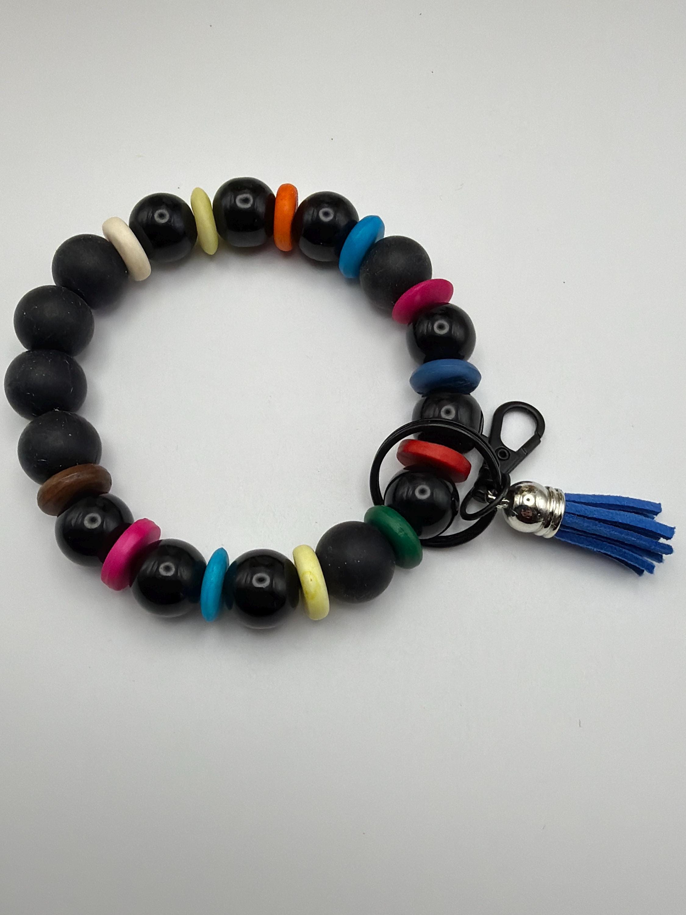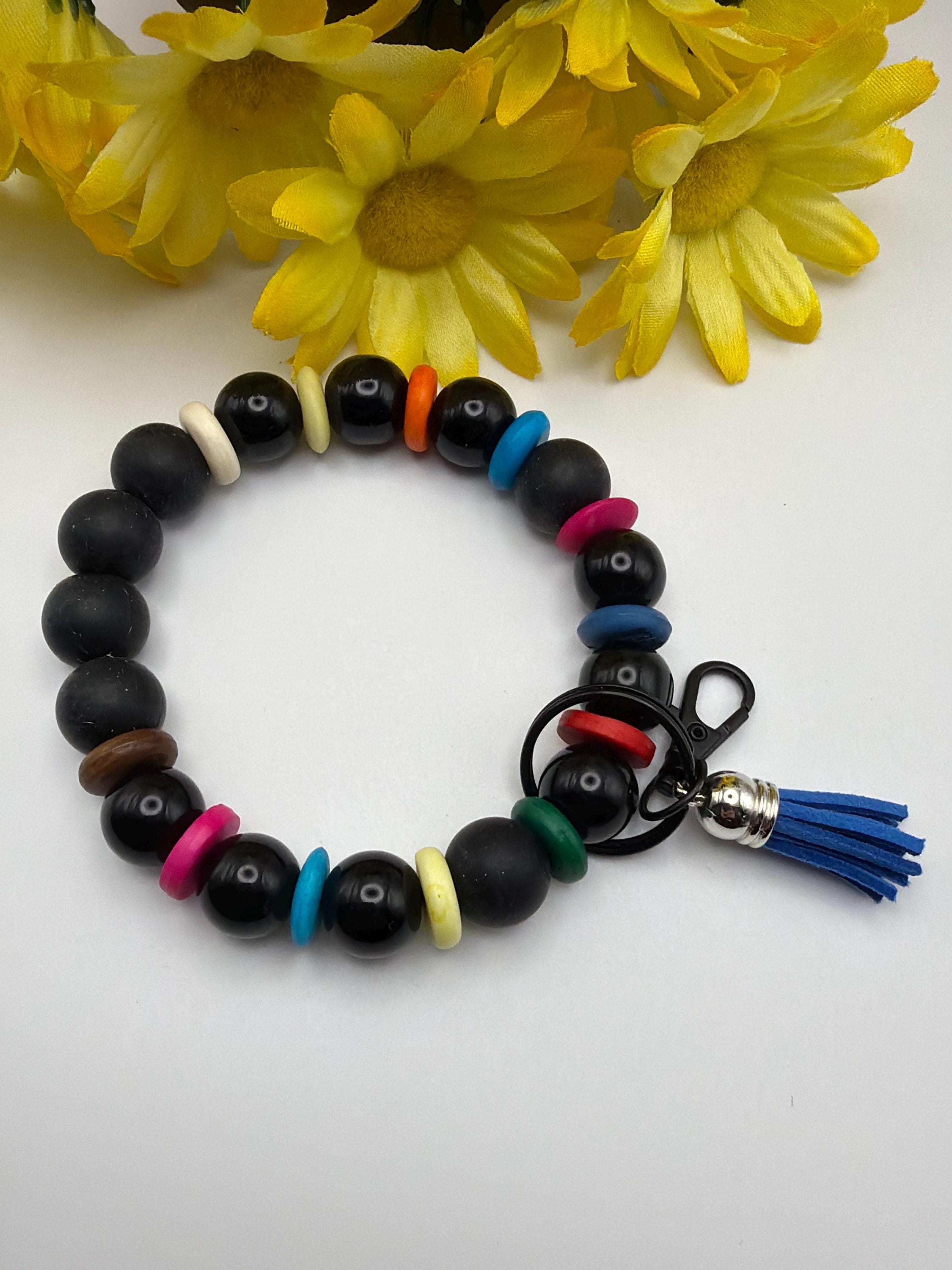 This wristlet is made with silicone and black glass beads and has a tassle. They are a great gift for someone or for you to brighten up your keychain or to hold your key fob.