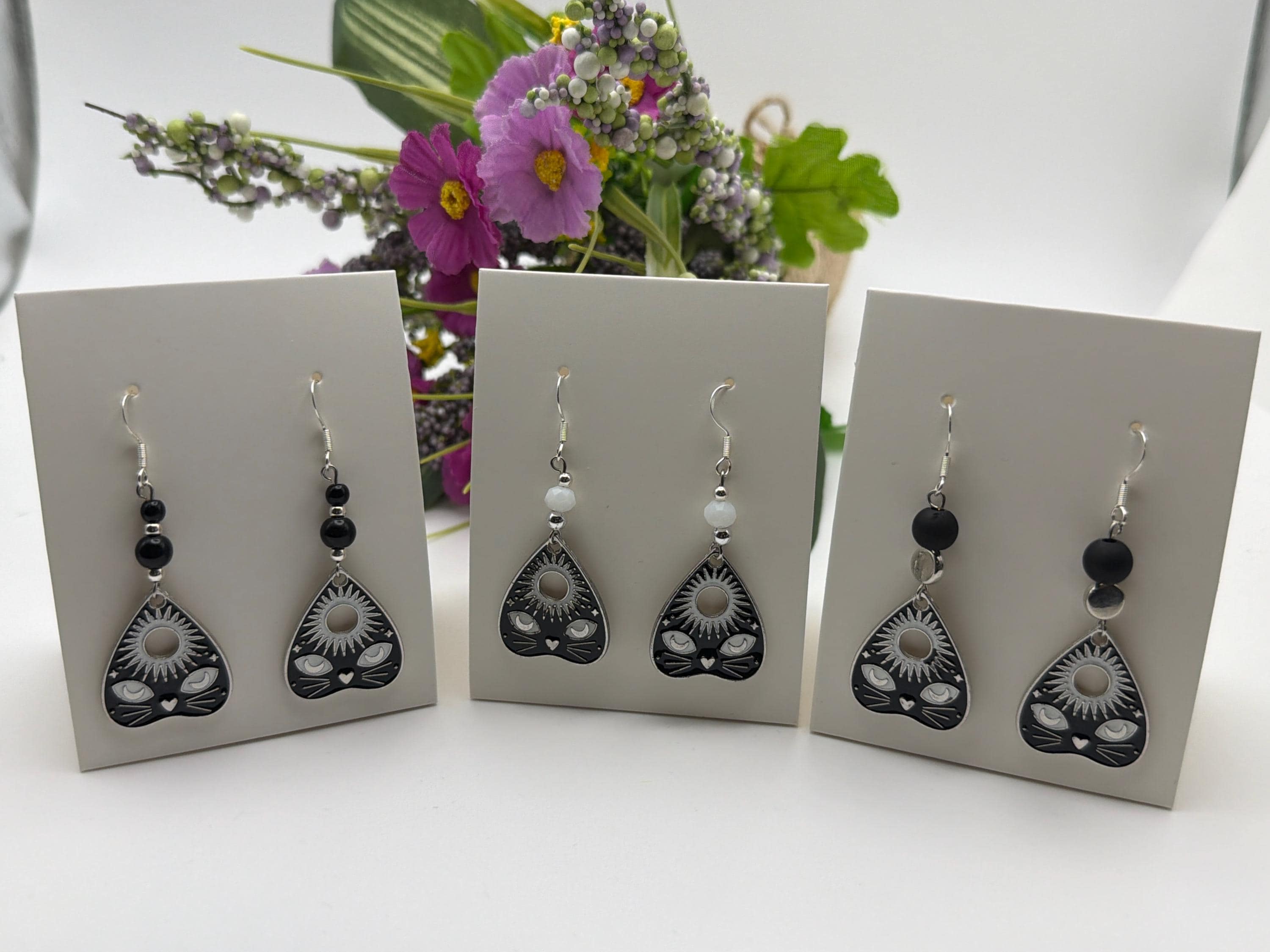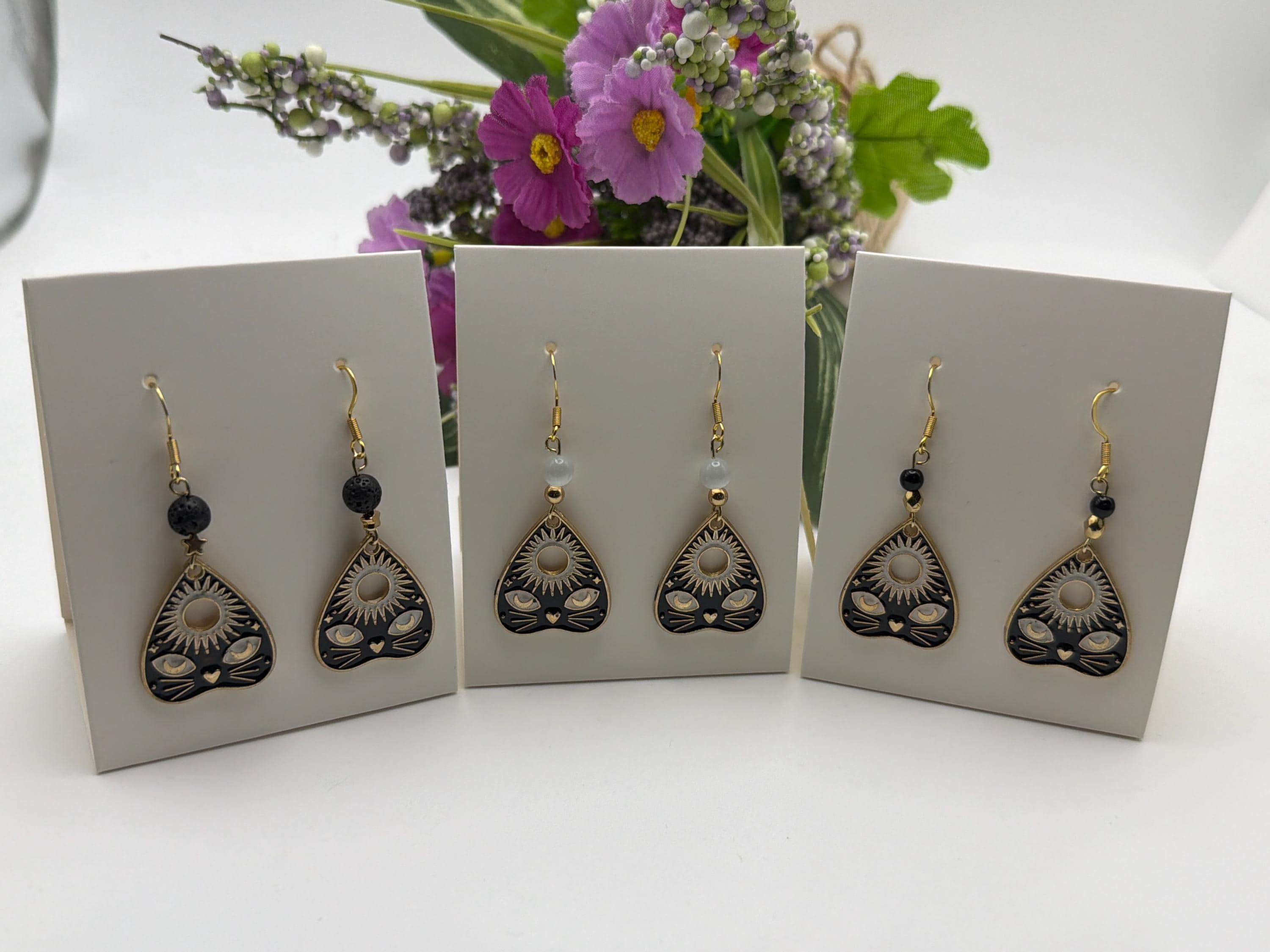 These earrings are made with Tarot inspired planchette charms. They are finished with gemstones and/or metal findings. Perfect for Halloween or a Ouija game night. Or just a regular Tuesday.