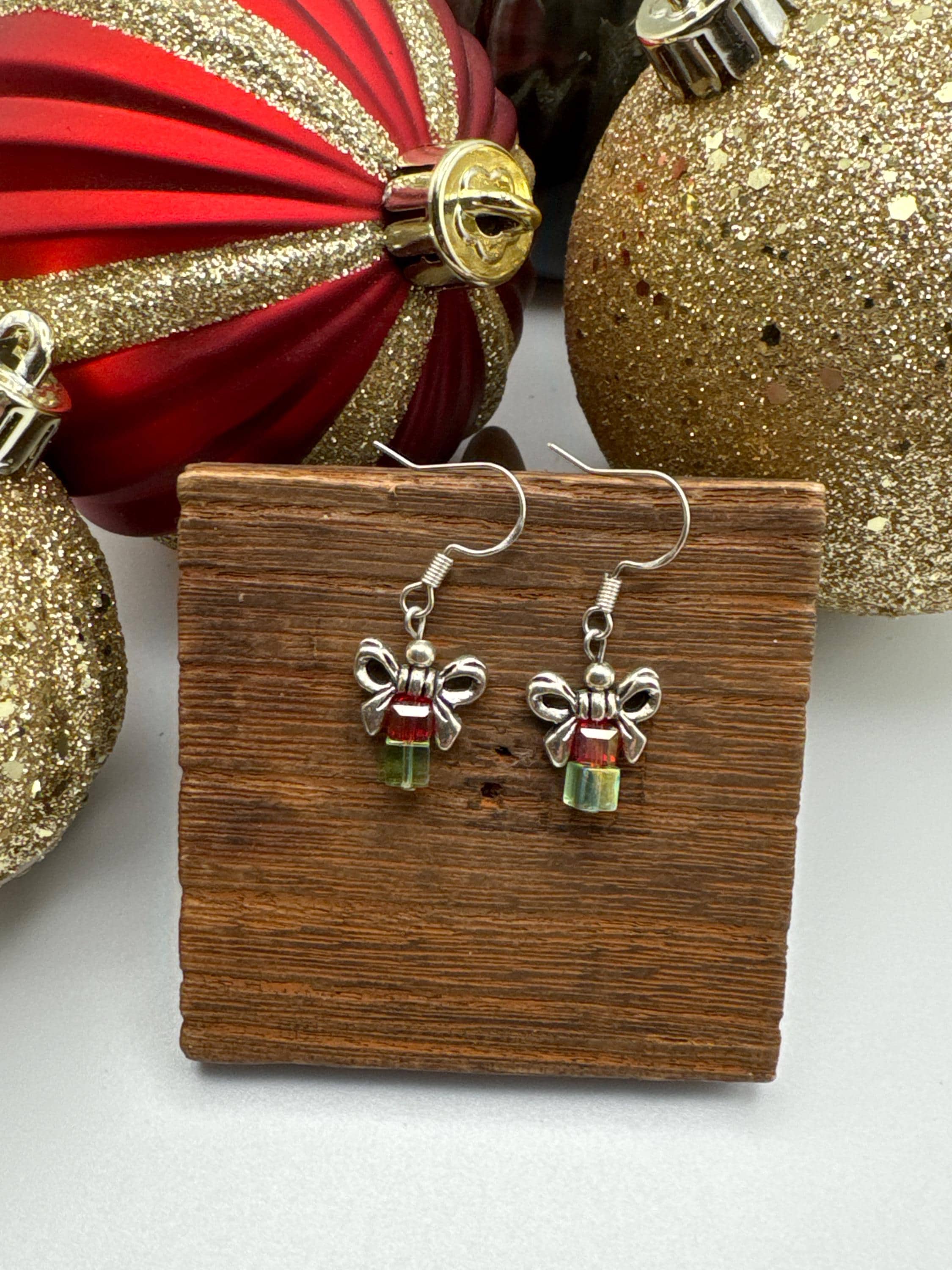These earrings are made with red and green square beads and have a Tibetan bow on Sterling Silver Findings.
