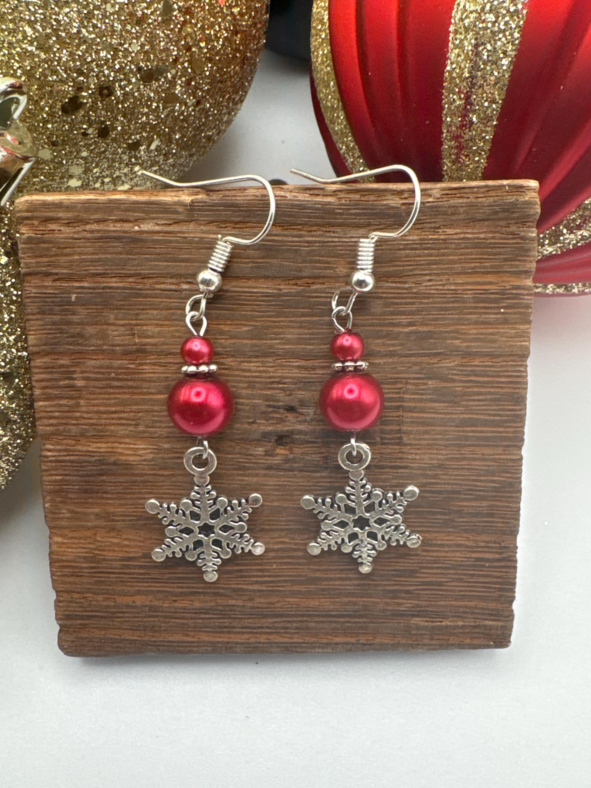 These earrings are made with a Tibetan snowflake and red pearl glass beads.