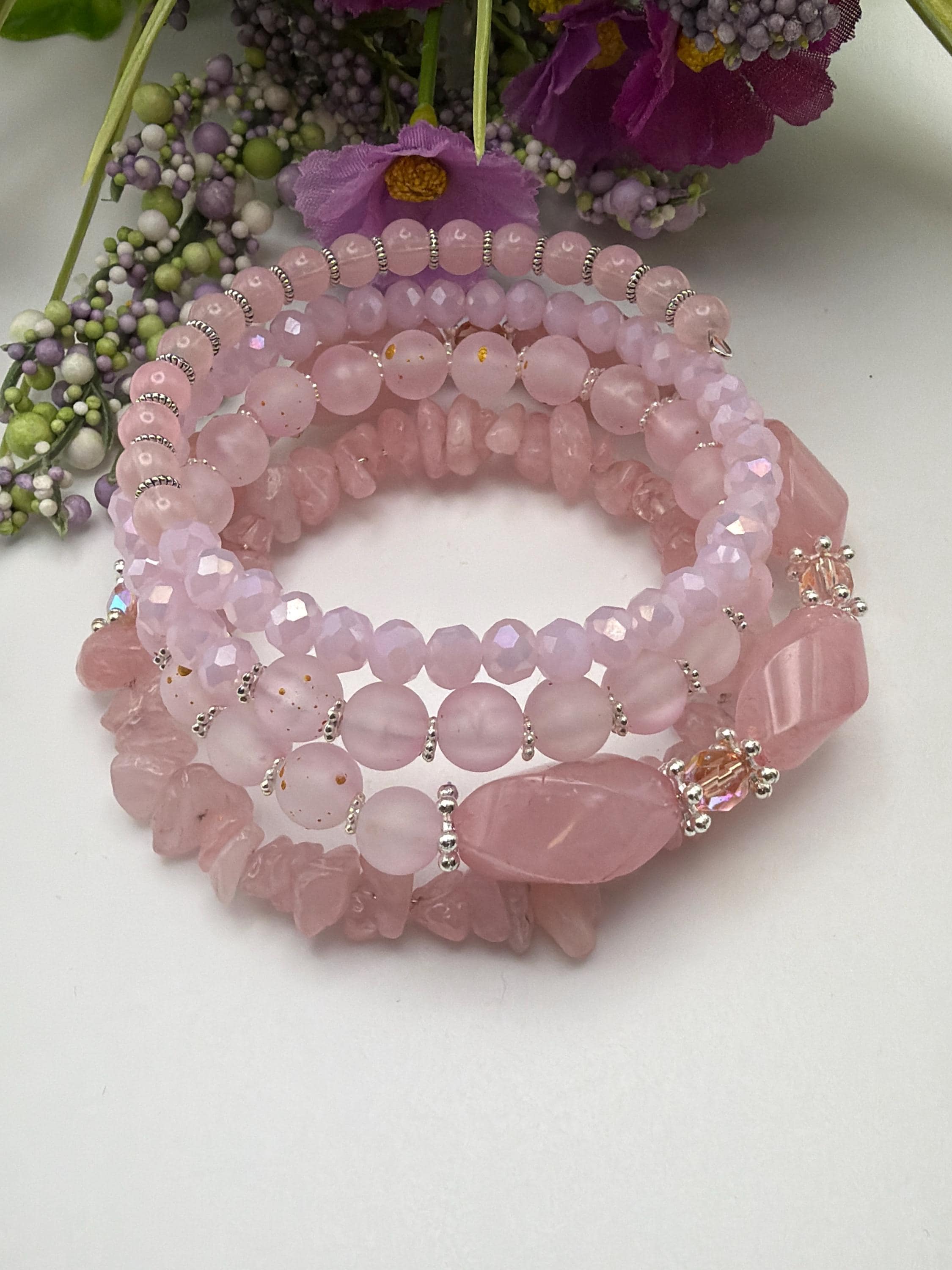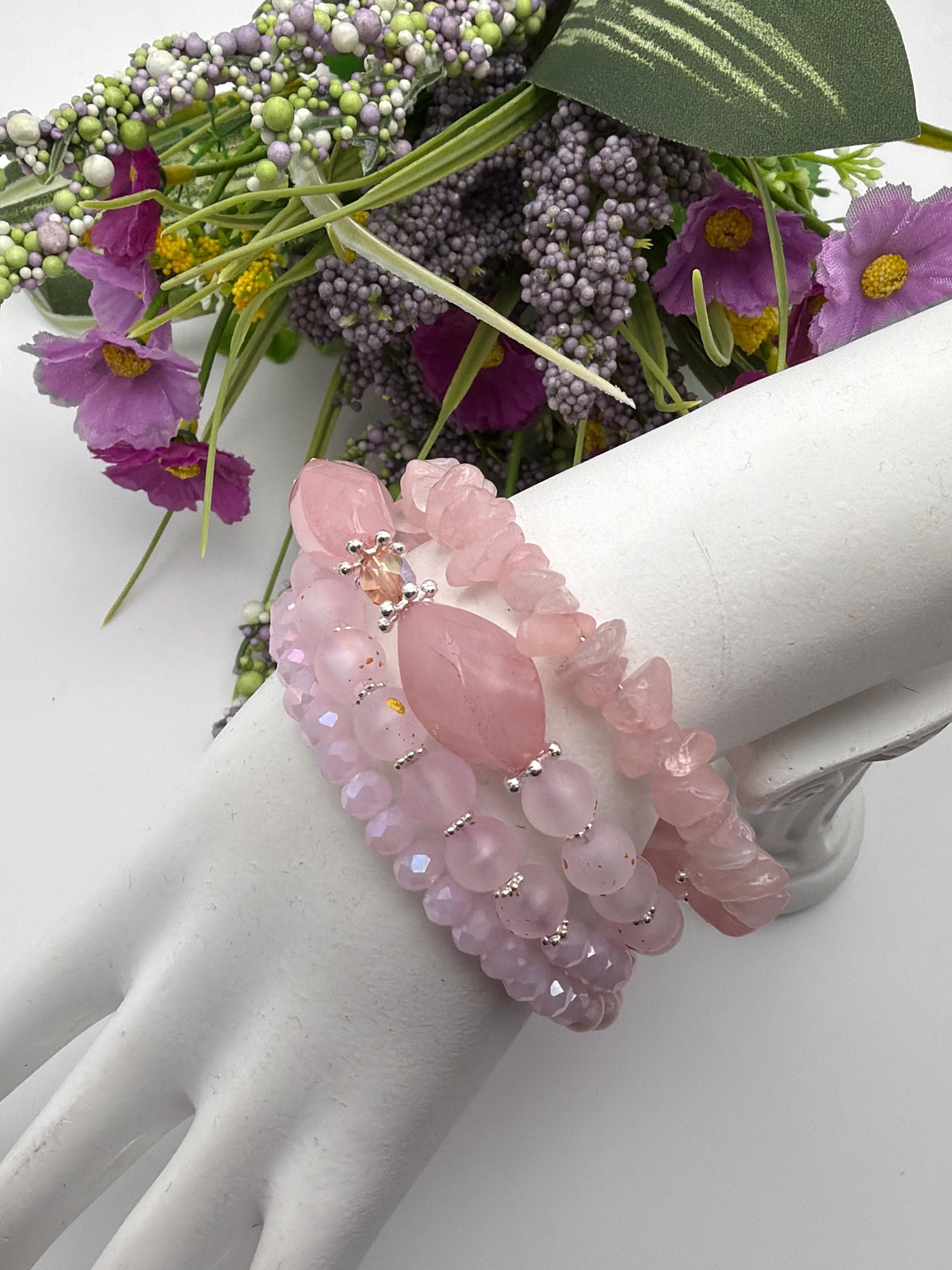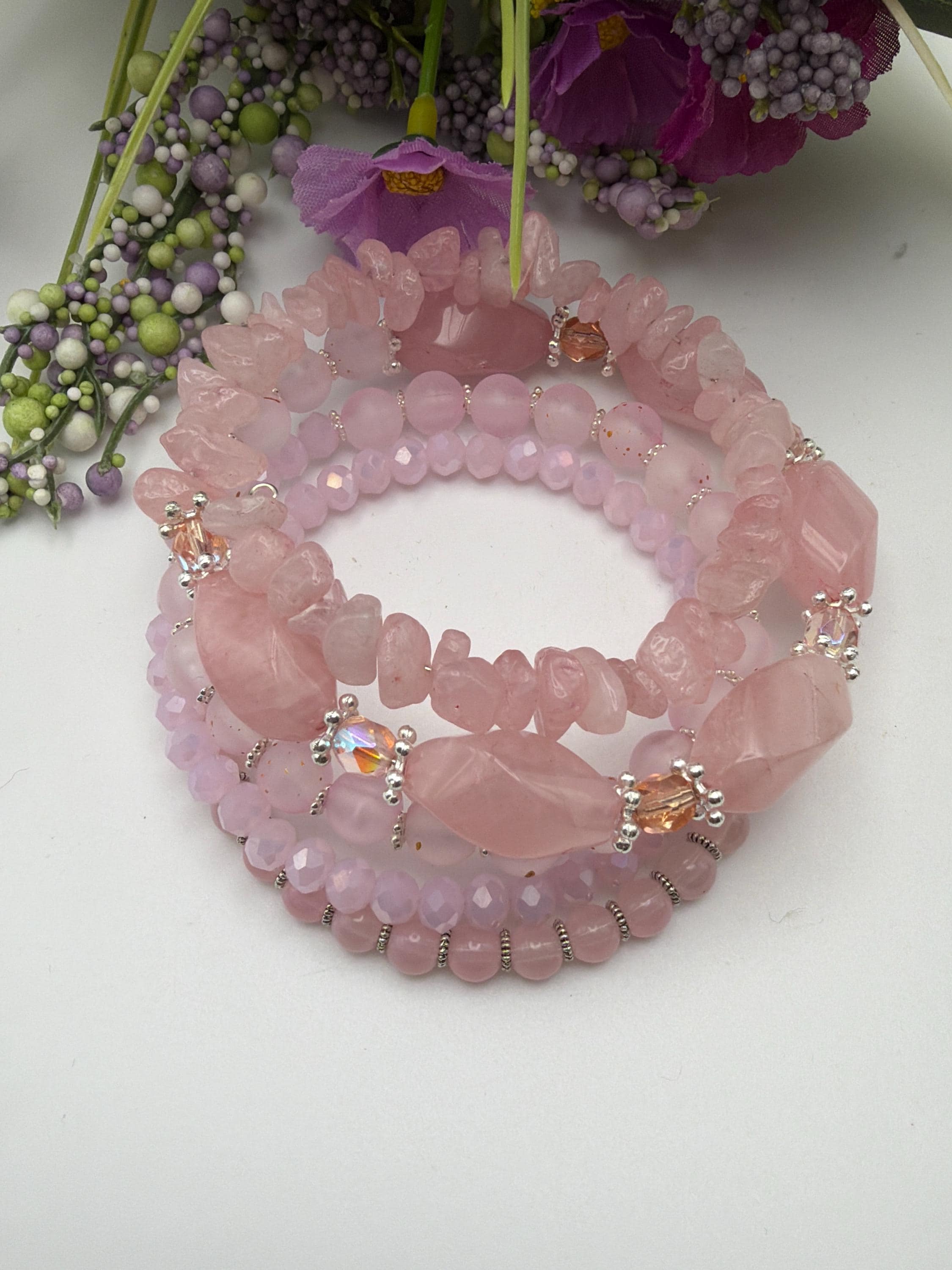 This bracelet is made with Rose Quartz Stone Chip beads, daisy spacers, smoke glass pink beads, silver circle spacers and pink glass faceted beads.